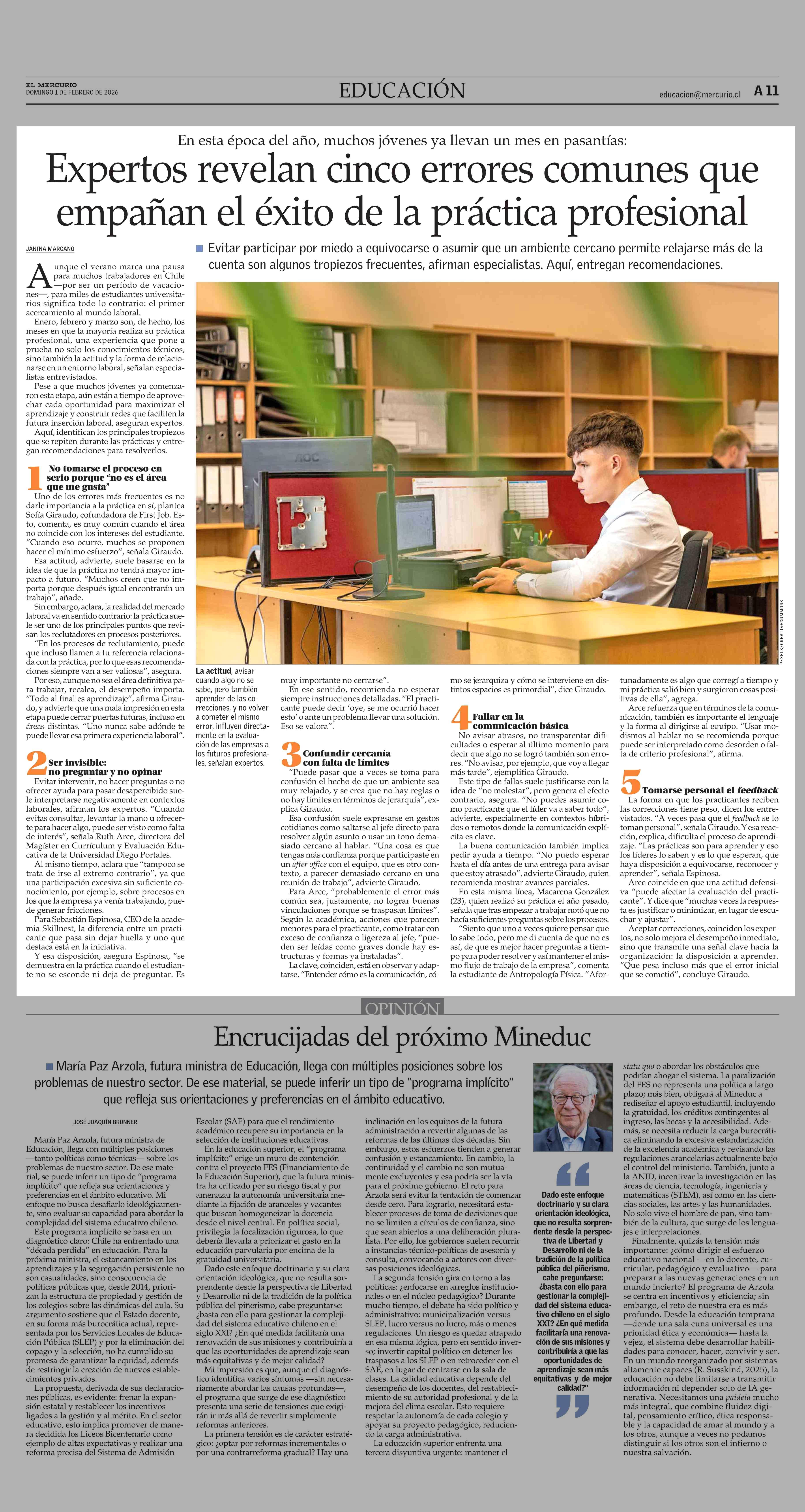 Expertos revelan cinco errores comunes que empañan el éxito de la práctica profesional 01-02-2026 El Mercurio |