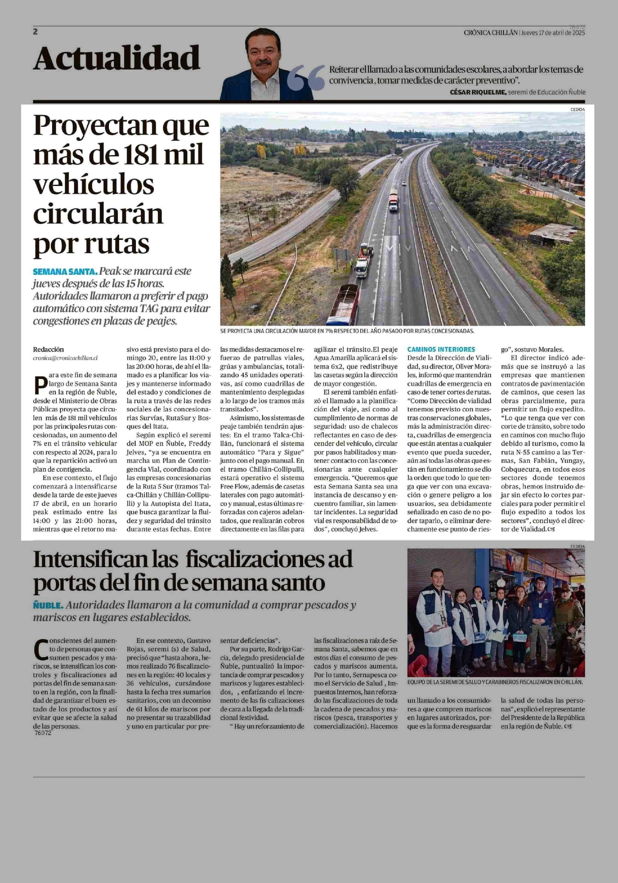 Proyectan que más de 181 mil vehículos circularán por rutas 17-04-2025 Crónica de Chillán |