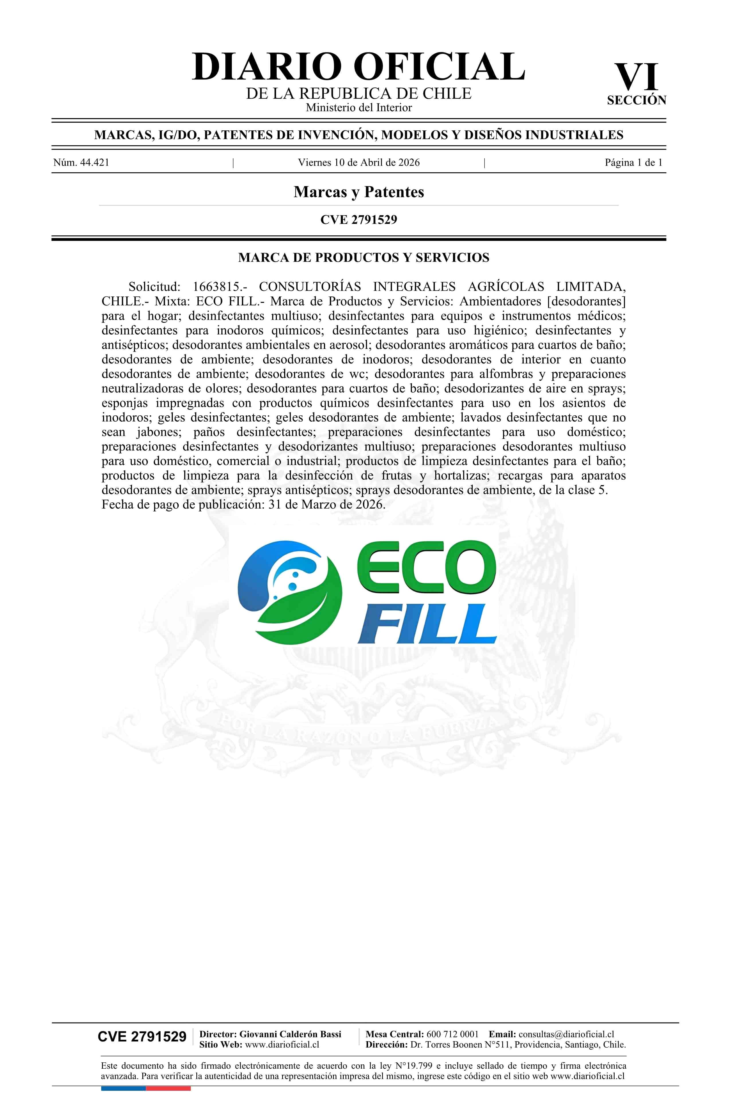 Fuente: Diario Oficial Edición Electrónica (Diario Oficial de Chile - 6 Marcas Y Patentes) Página(s): 526