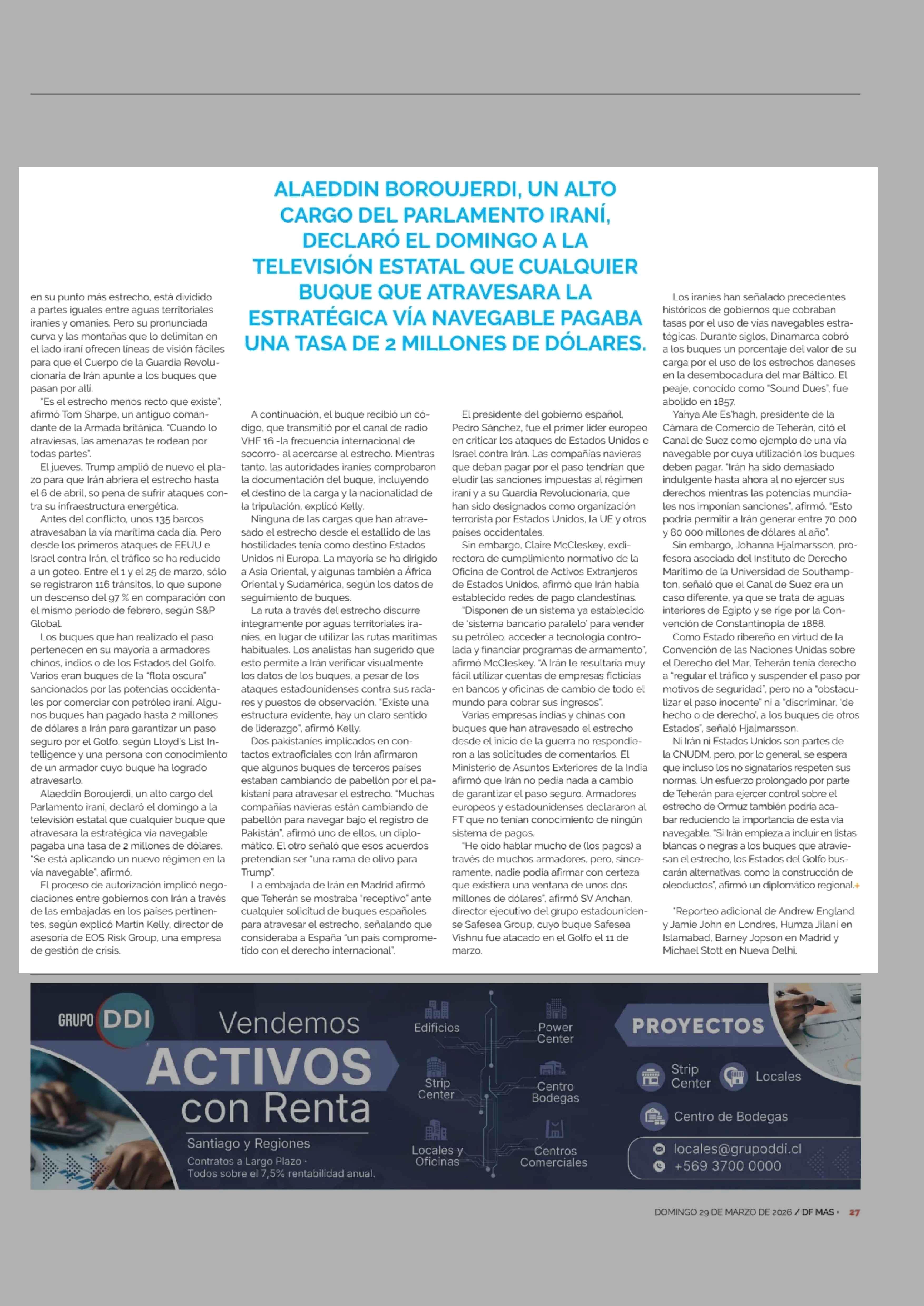 CÓMO IRÁN PRETENDE SACAR PROVECHO DEL ESTRECHO DE ORMUZ 29-03-2026 Diario Financiero |
