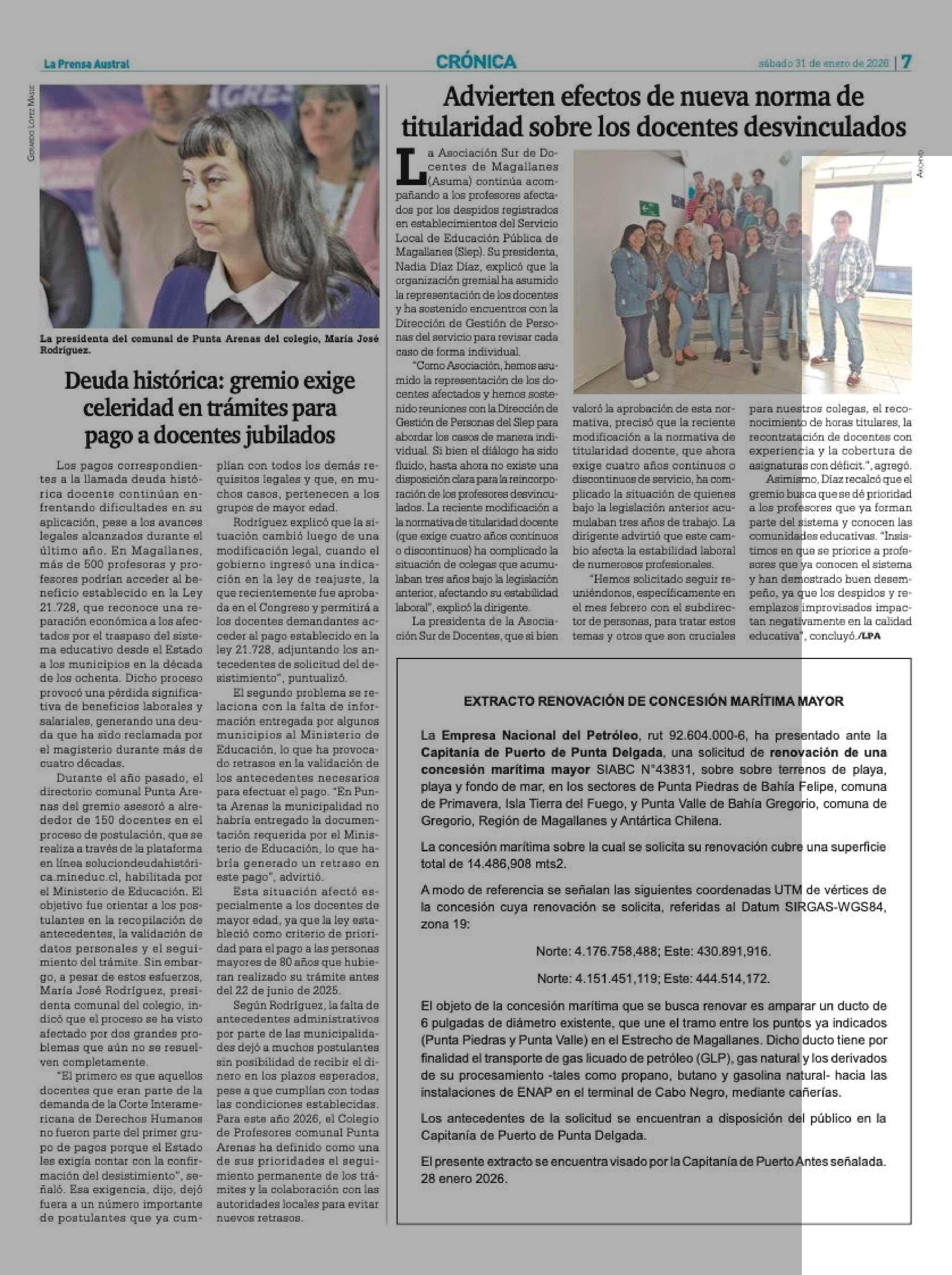 Advierten efectos de nueva norma de titularidad sobre los docentes desvinculados 31-01-2026 La Prensa Austral |