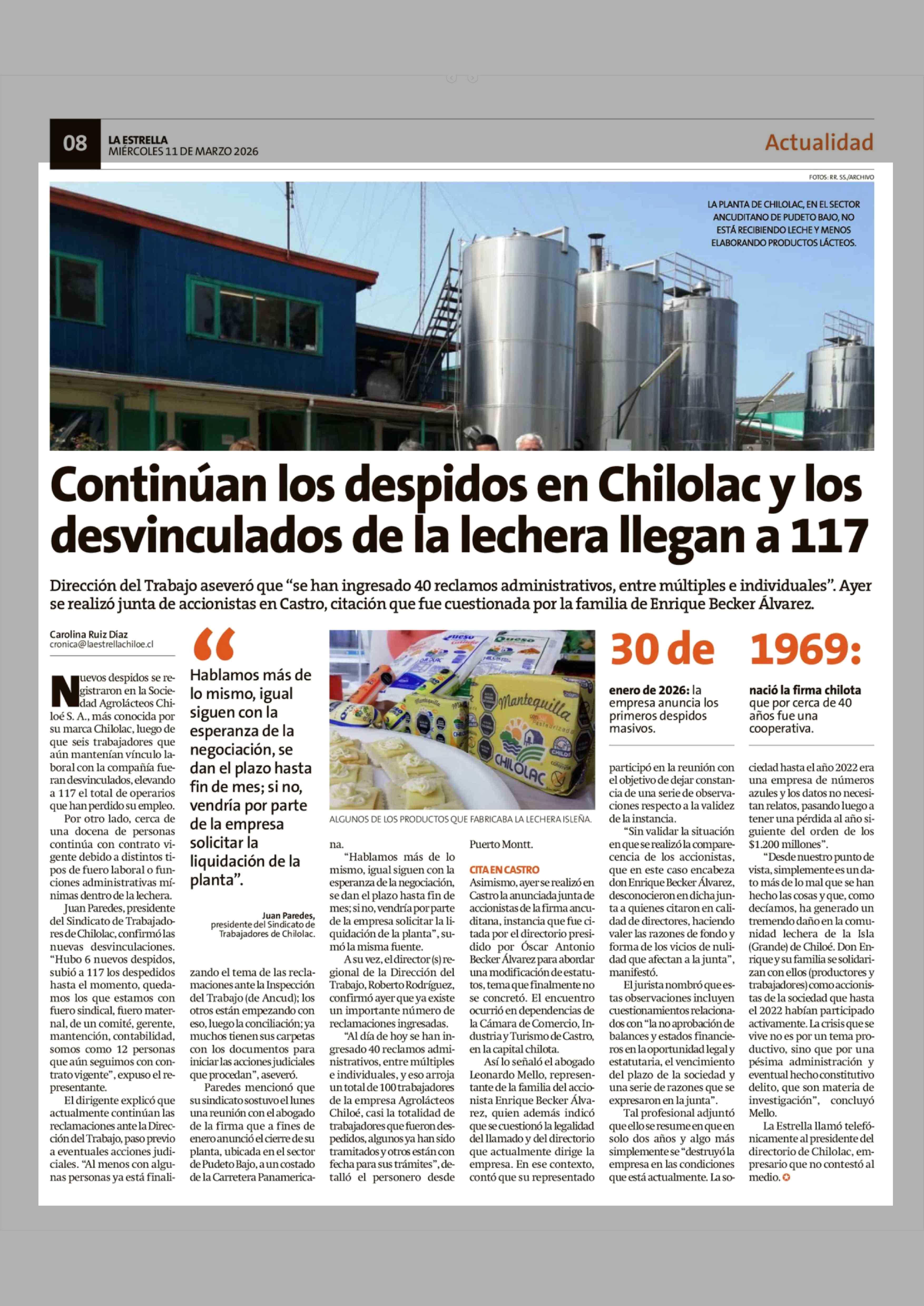 Título: Continúan los despidos en Chilolac y los desvinculados de la lechera llegan a 117