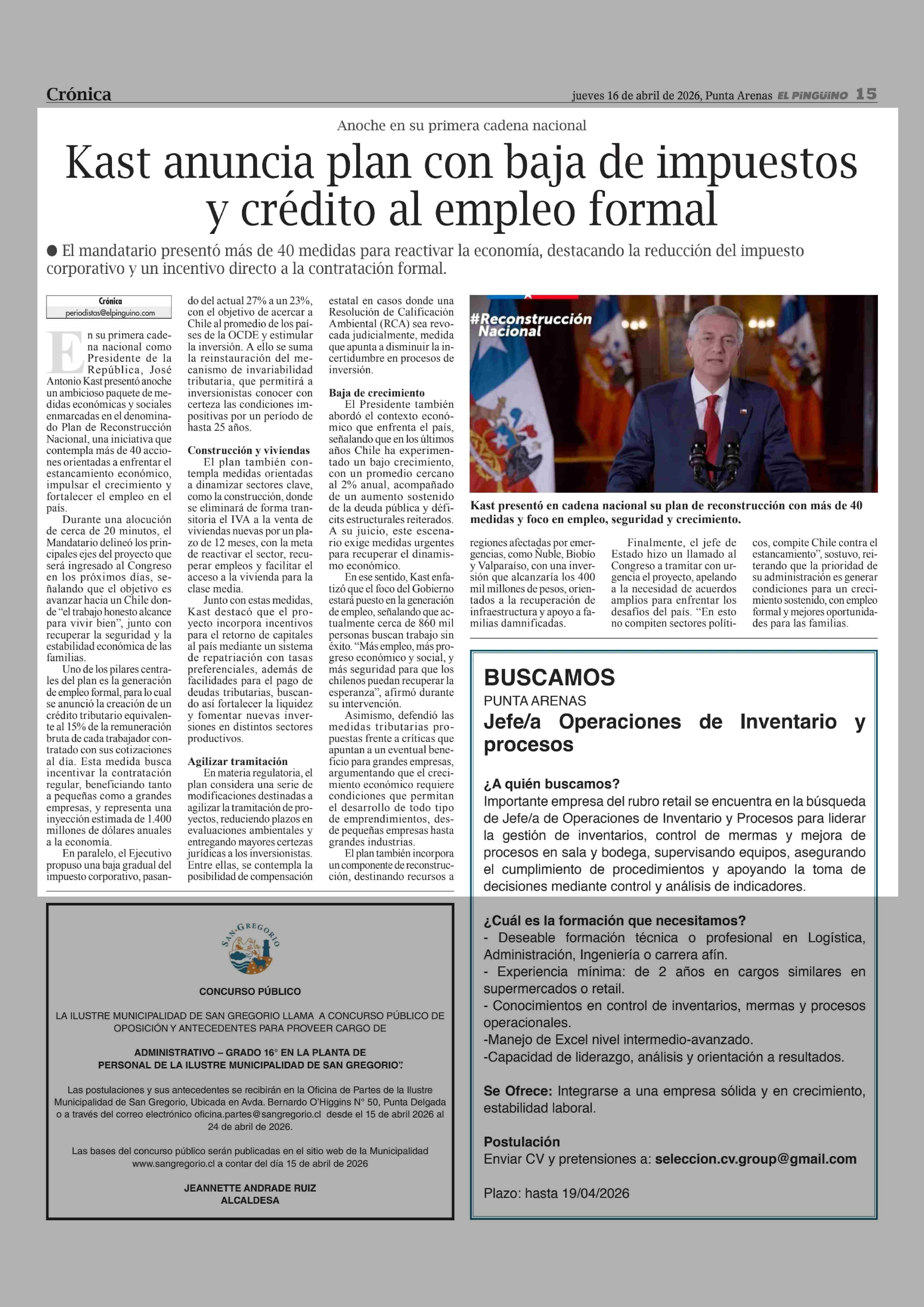 Kast anuncia plan con baja de impuestos y crédito al empleo formal 16-04-2026 El Pingüino |