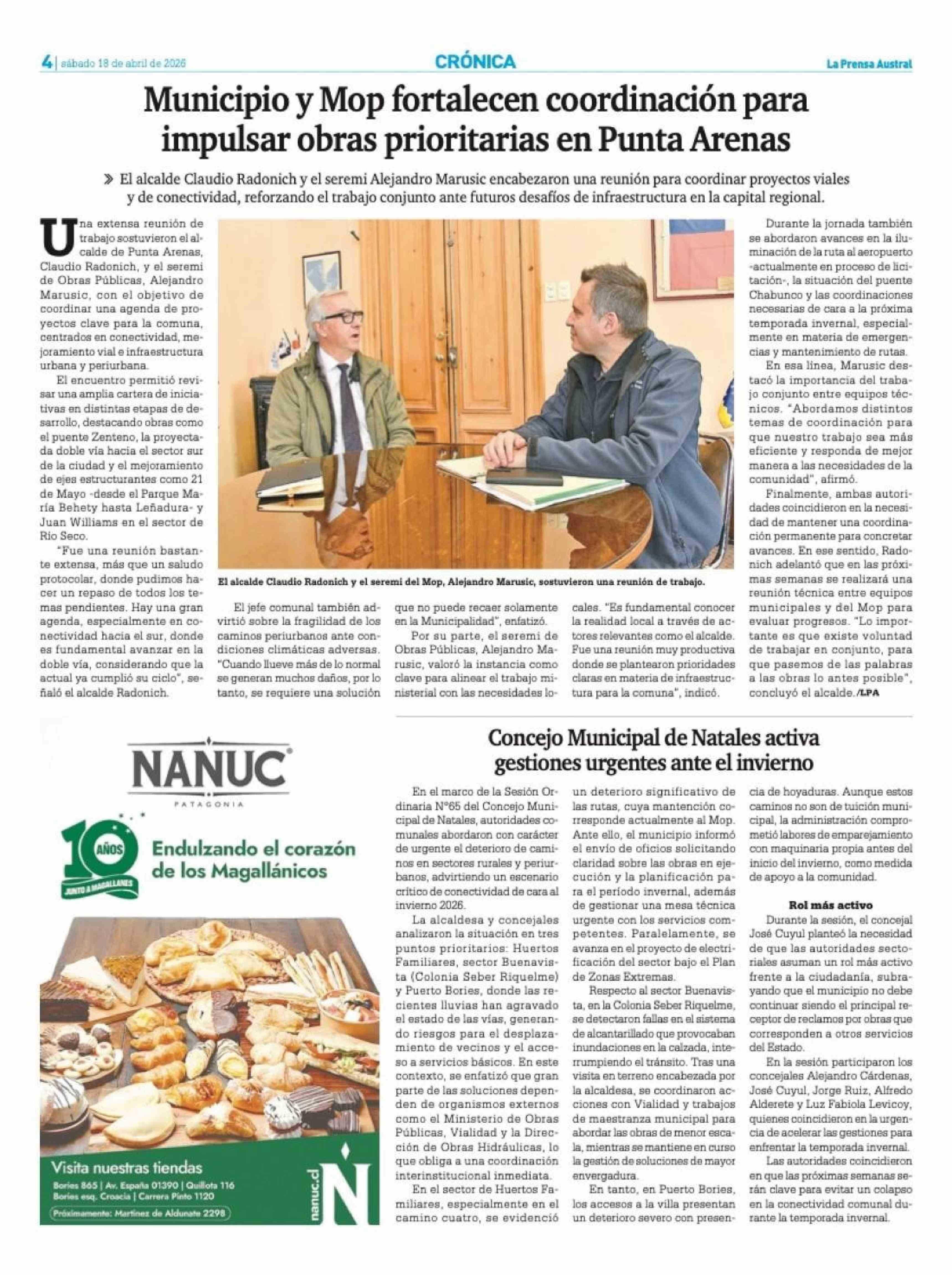 Municipio y Mop fortalecen coordinación para impulsar obras prioritarias en Punta Arenas 18-04-2026 La Prensa Austral |
