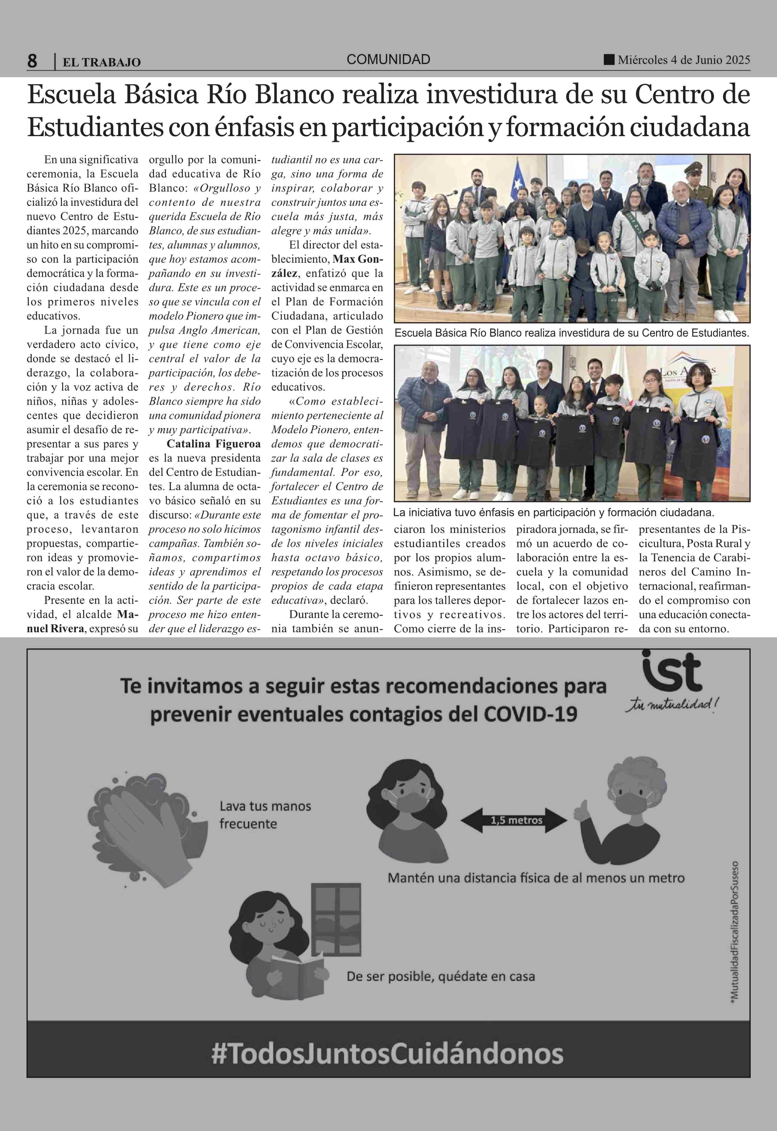 Escuela Básica Río Blanco realiza investidura de su Centro de Estudiantes con énfasis en participación y formación ciudadana 04-06-2025 El Trabajo |