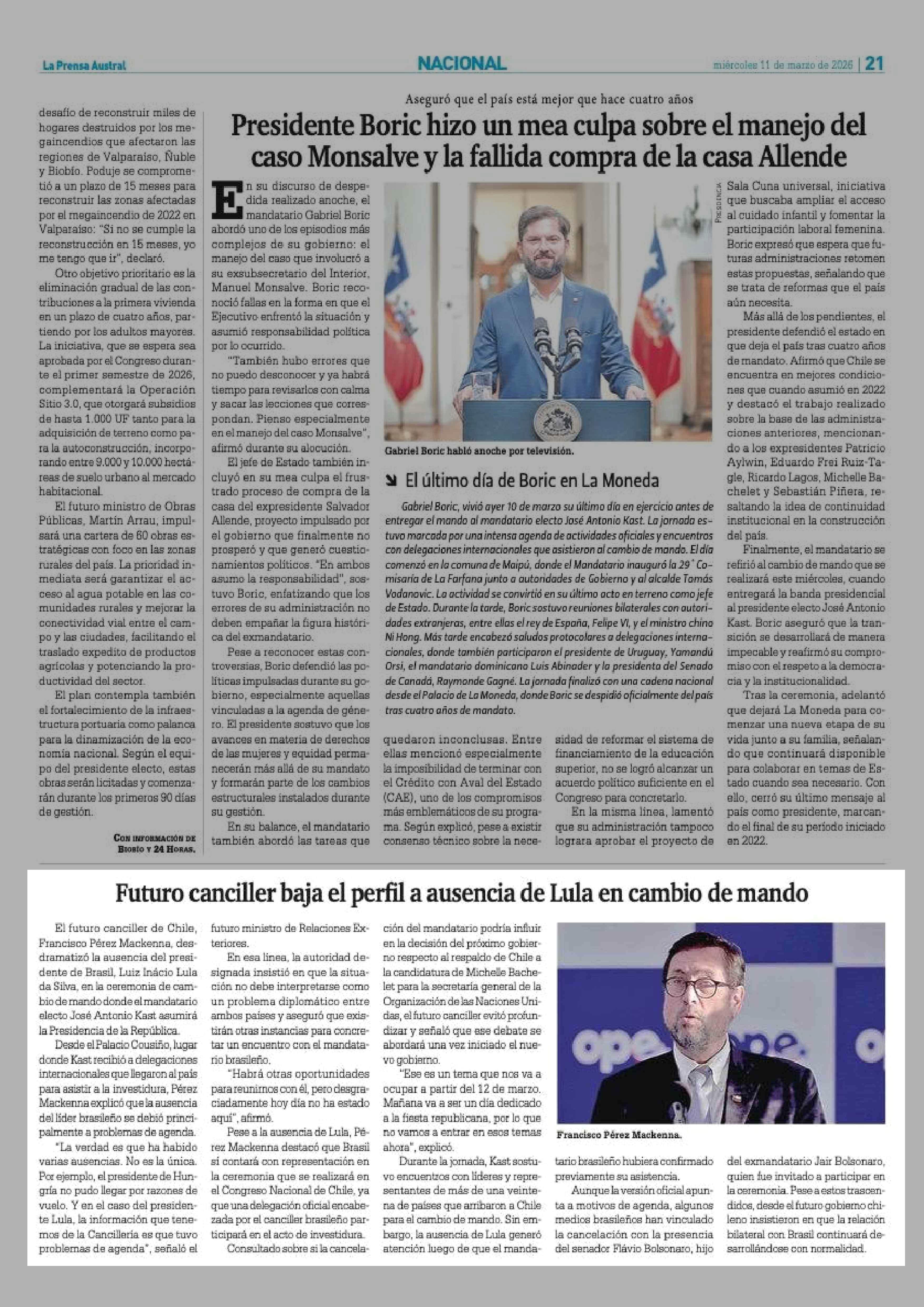 Futuro canciller baja el perfil a ausencia de Lula en cambio de mando 11-03-2026 La Prensa Austral |
