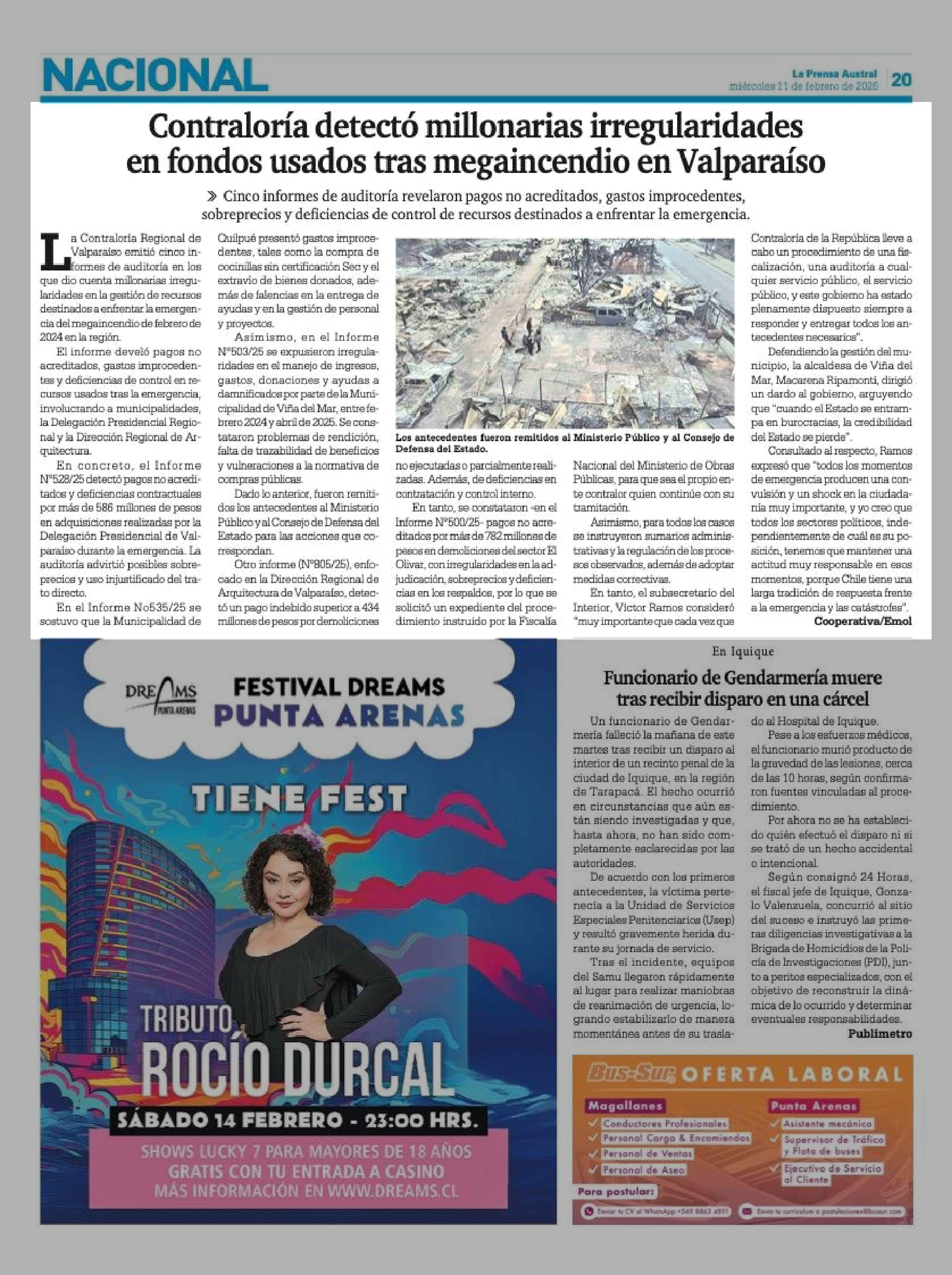Contraloría detectó millonarias irregularidades en fondos usados tras megaincendio en Valparaíso 11-02-2026 La Prensa Austral |