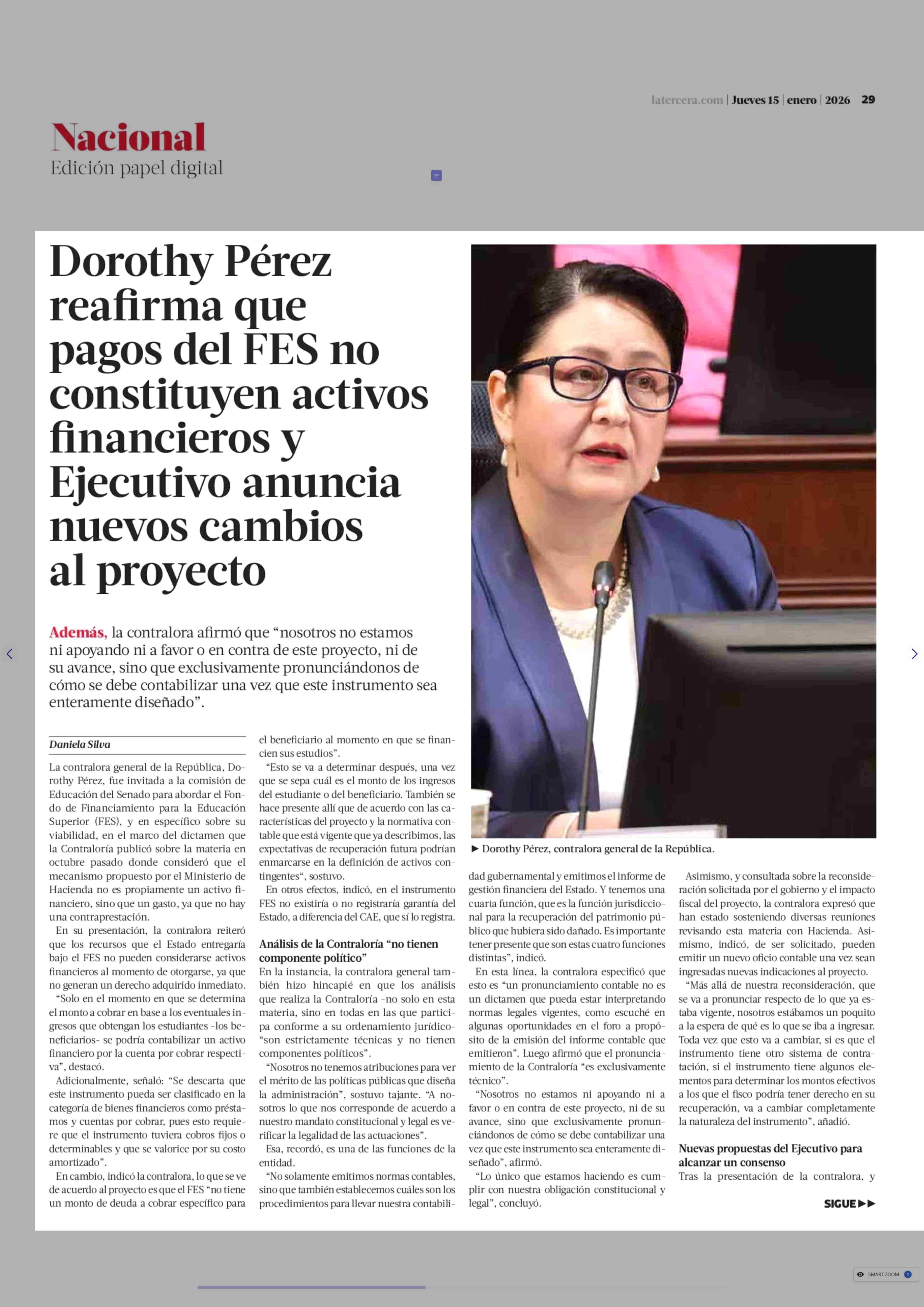 Dorothy Pérez reafirma que pagos del FES no constituyen activos financieros y Ejecutivo anuncia nuevos cambios al proyecto 15-01-2026 La Tercera |