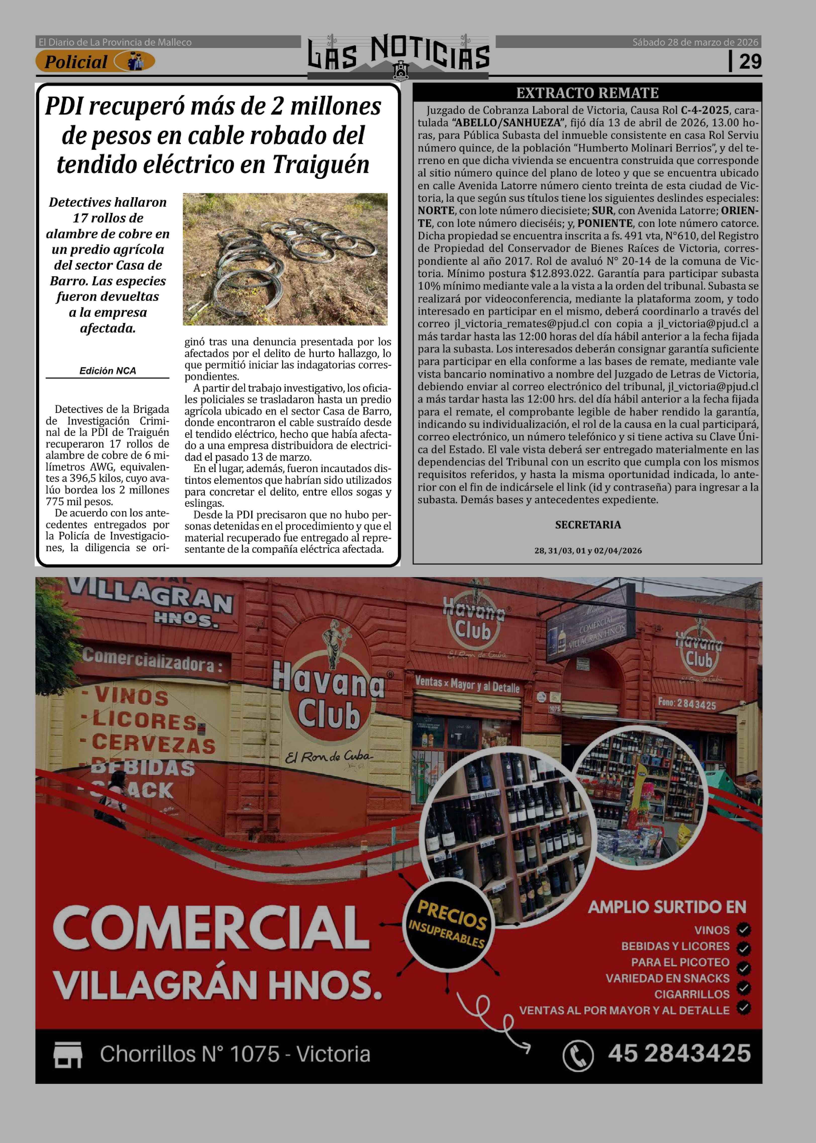PDI recuperó más de 2 millones de pesos en cable robado del tendido eléctrico en Traiguén 28-03-2026 Las Noticias |