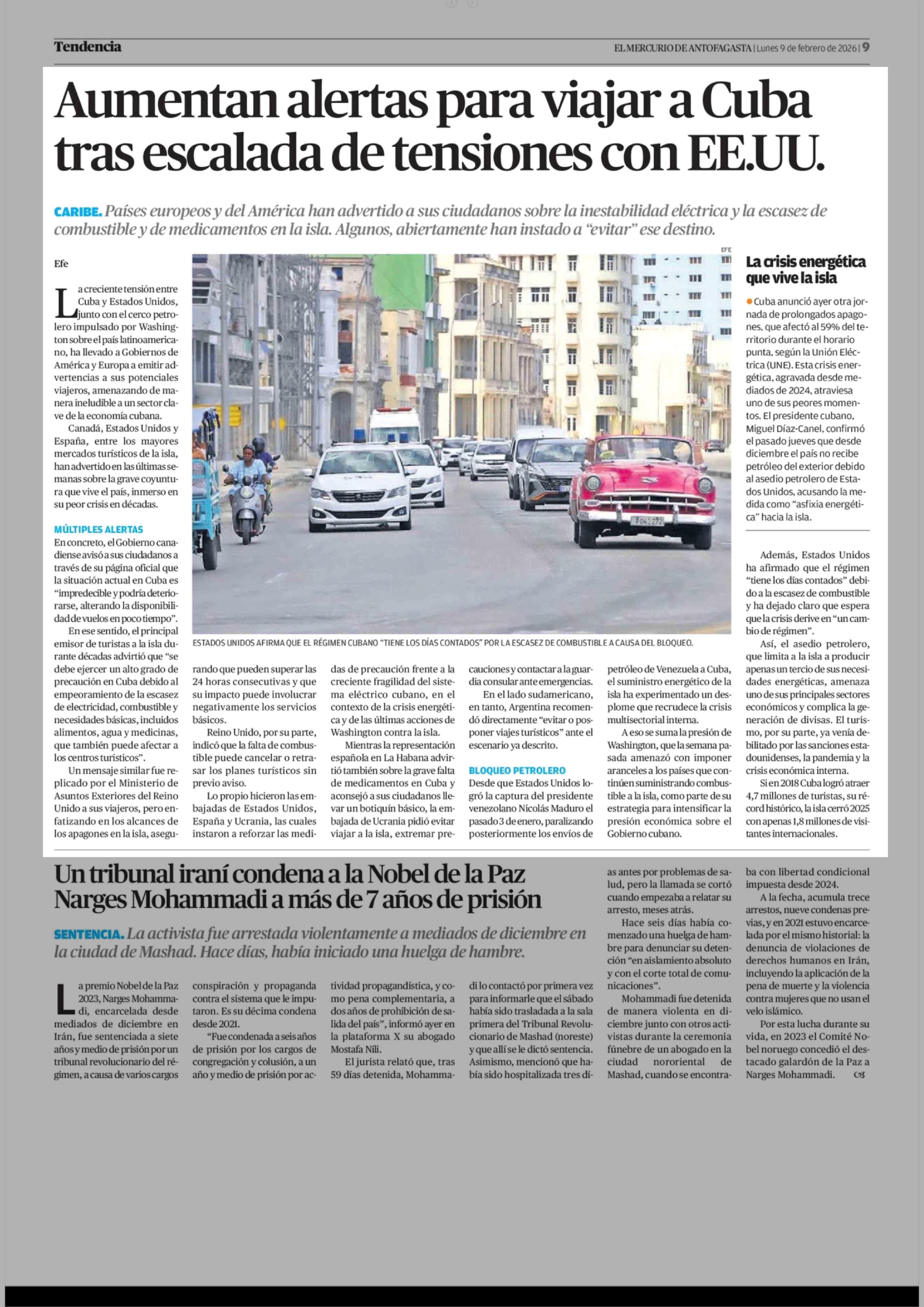 Aumentan alertas para viajar a Cuba tras escalada de tensiones con EE.UU. 09-02-2026 El Mercurio de Antofagasta |