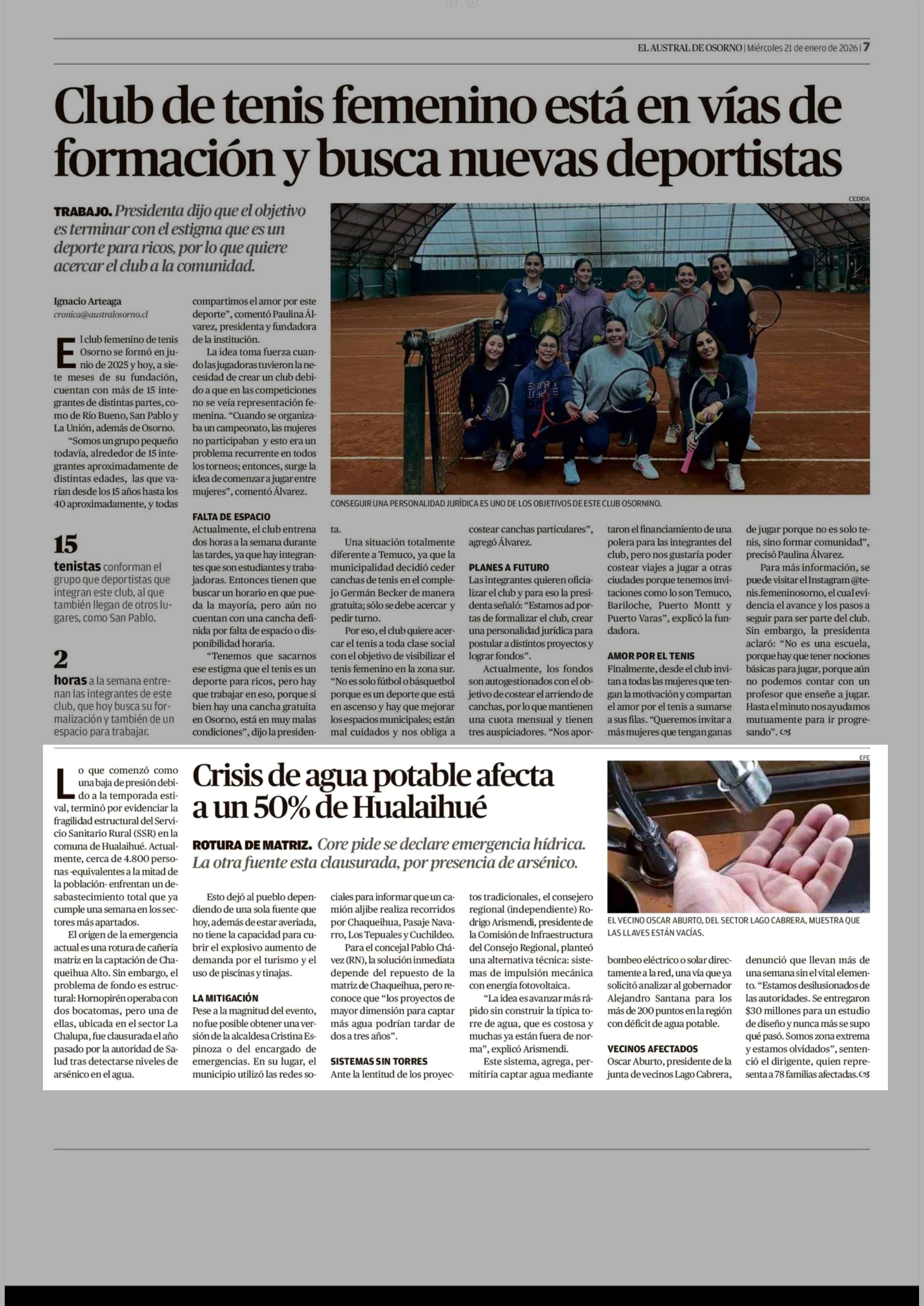 Crisis de agua potable afecta a un 50% de Hualaihué 21-01-2026 El Austral de Osorno |