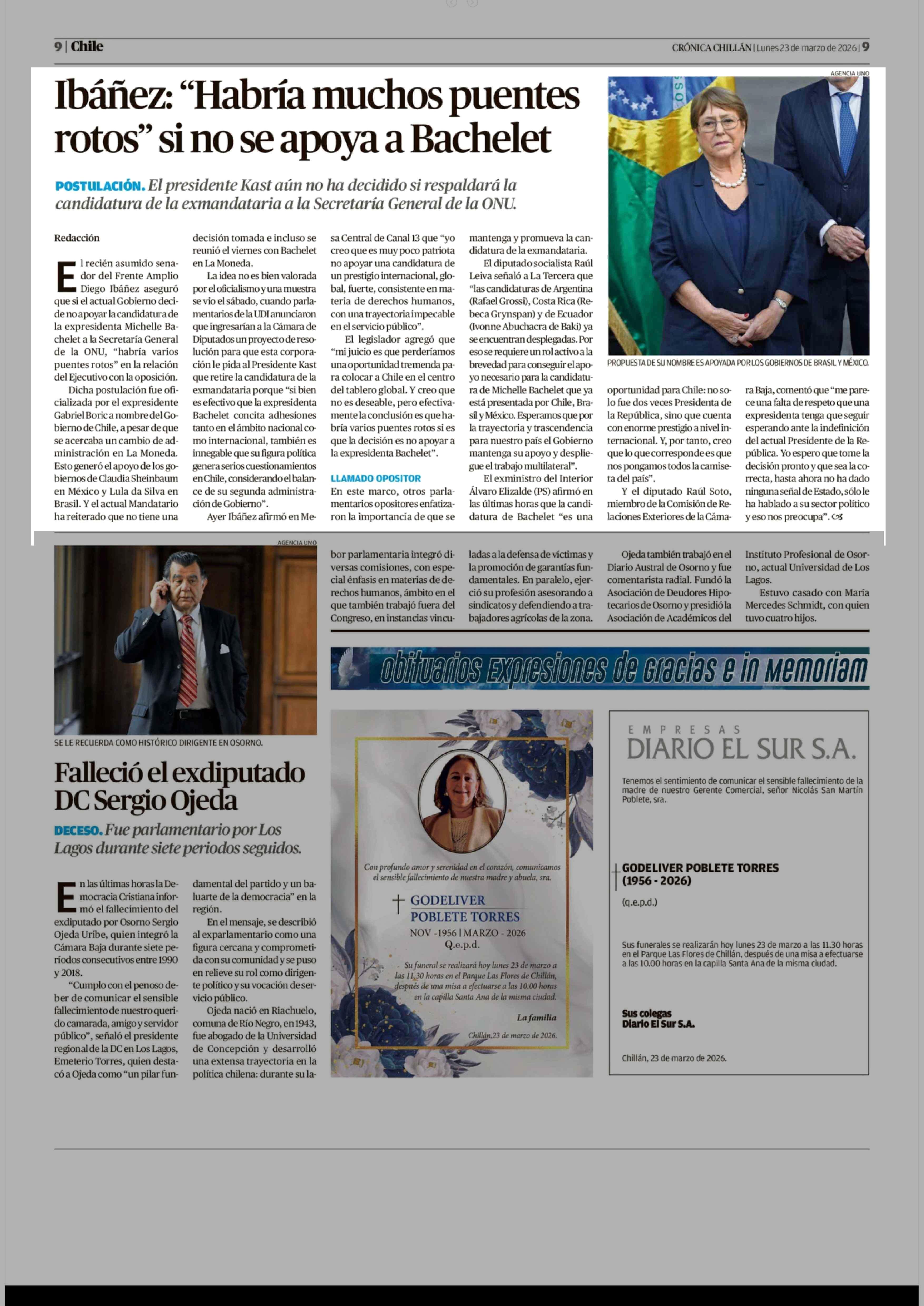 Ibáñez: “Habría muchos puentes rotos” si no se apoya a Bachelet 23-03-2026 Crónica de Chillán |