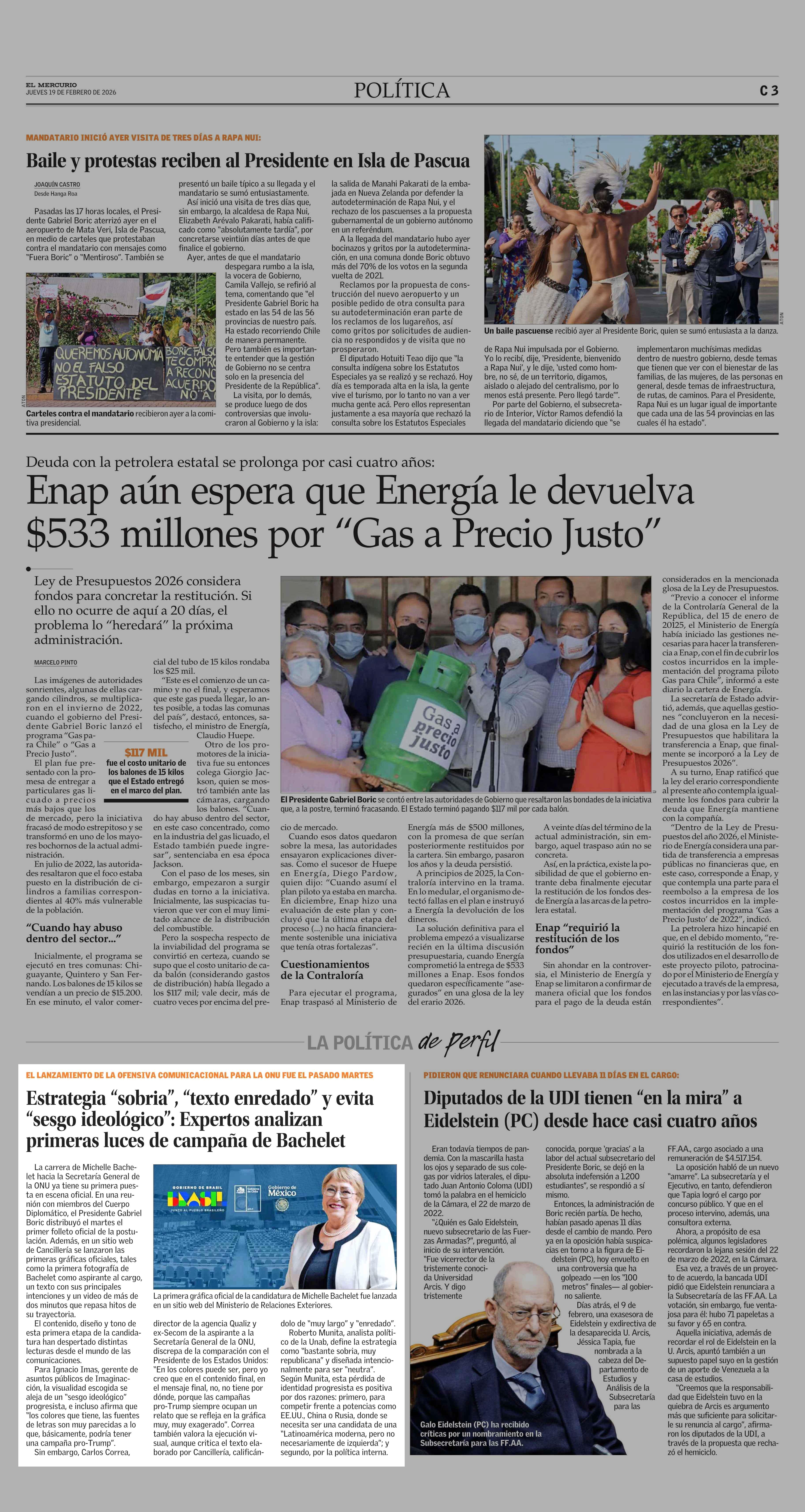 Estrategia “sobria”, “texto enredado” y evita “sesgo ideológico”: Expertos analizan primeras luces de campaña de Bachelet 19-02-2026 El Mercurio |