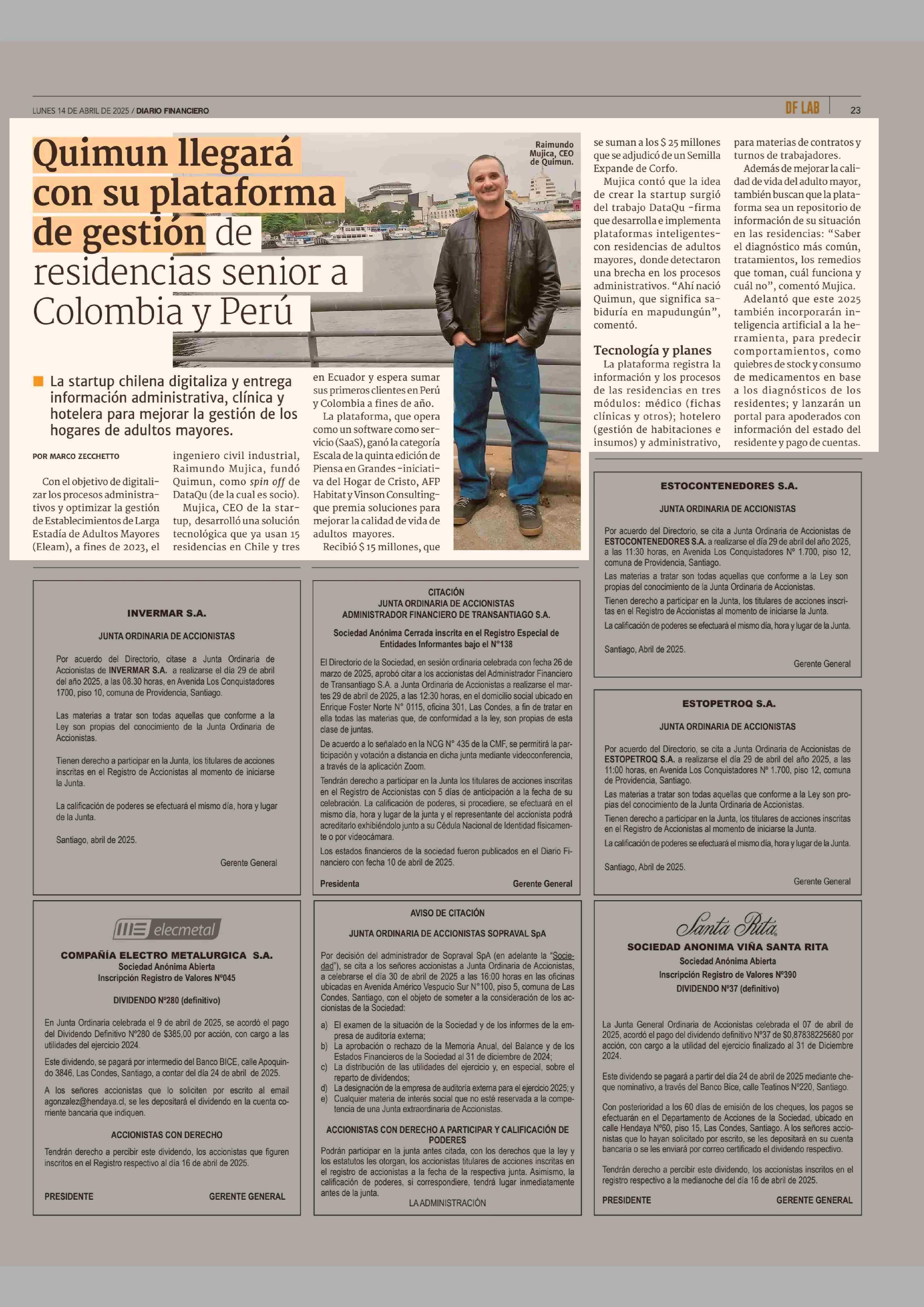 Quimun llegará con su plataforma de gestión de residencias senior a Colombia y Perú 14-04-2025 Diario Financiero |