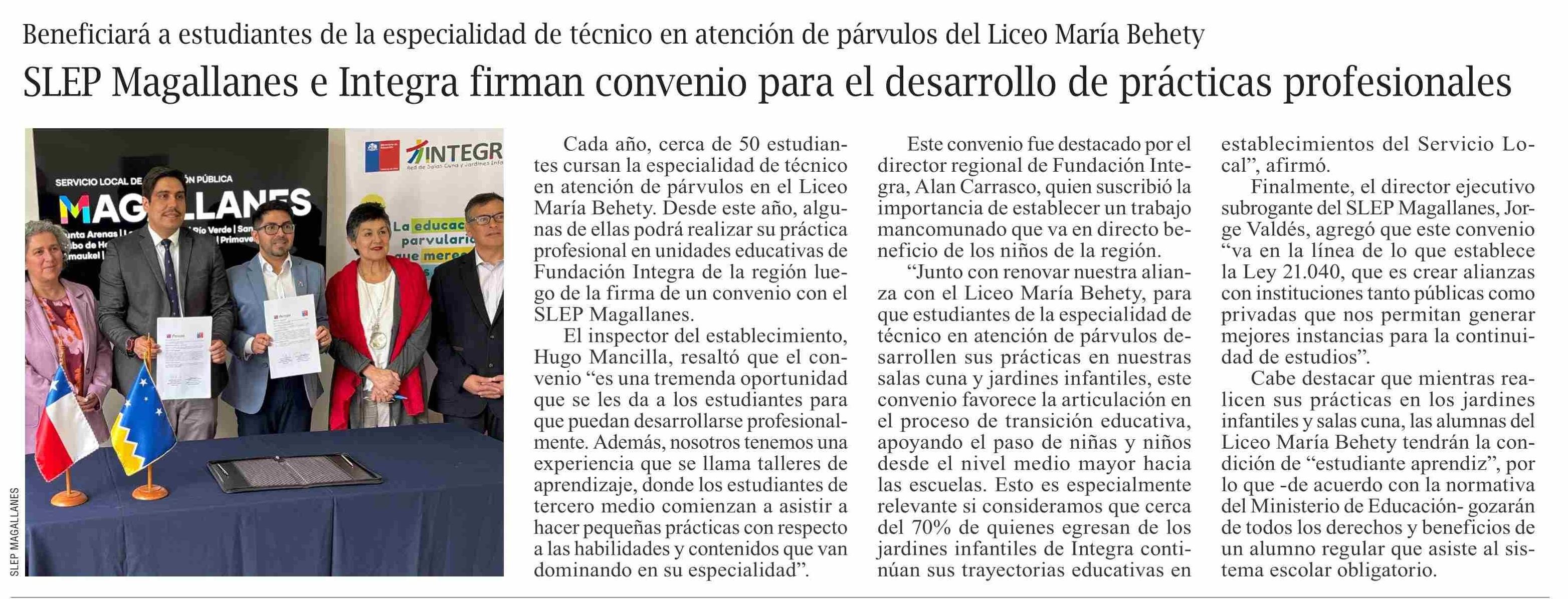| Título: | SLEP Magallanes e Integra firman convenio para el desarrollo de prácticas profesionales |