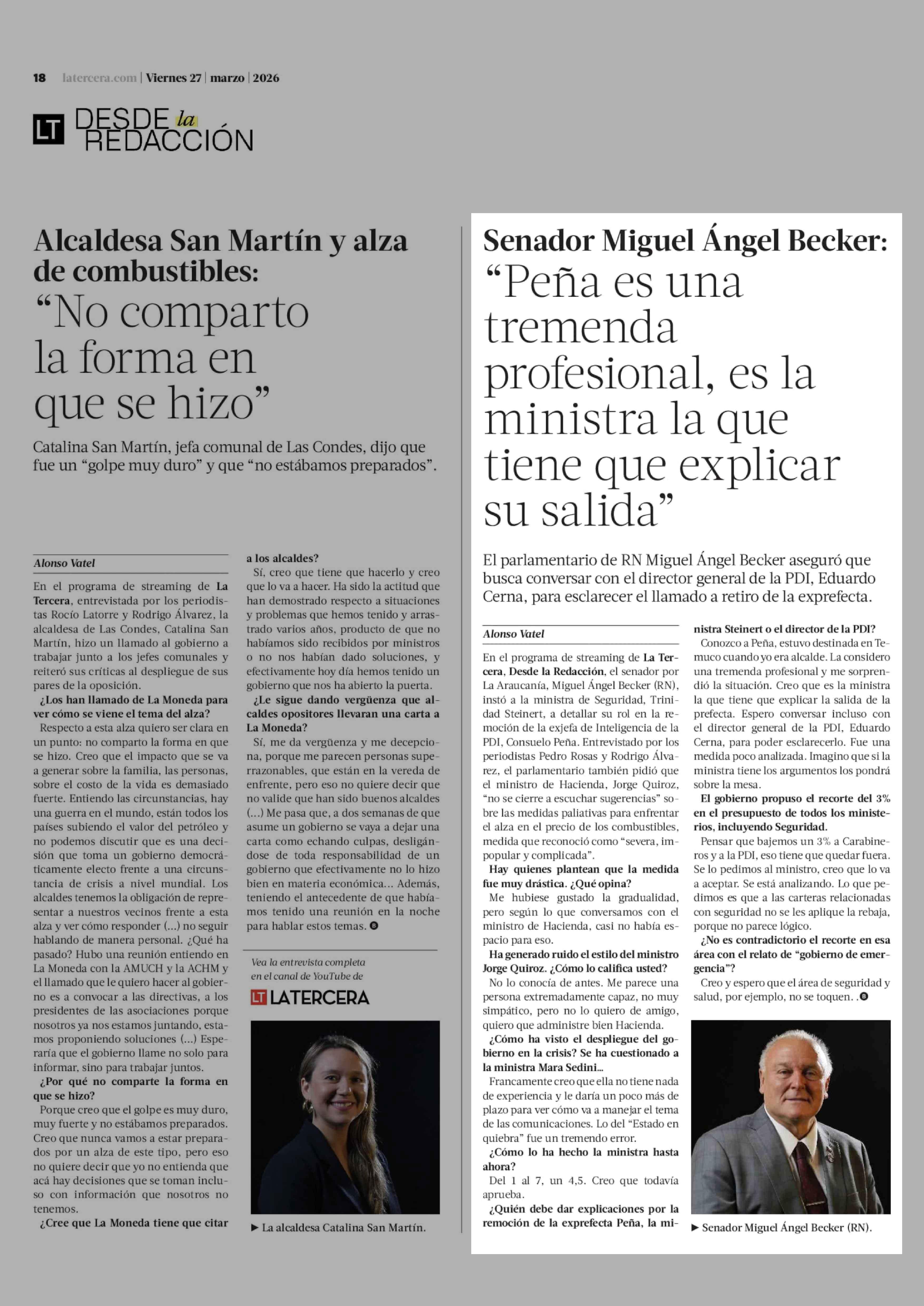 Senador Miguel Ángel Becker: "Peña es una tremenda profesional, es la ministra la que tiene que explicar su salida" 27-03-2026 La Tercera |