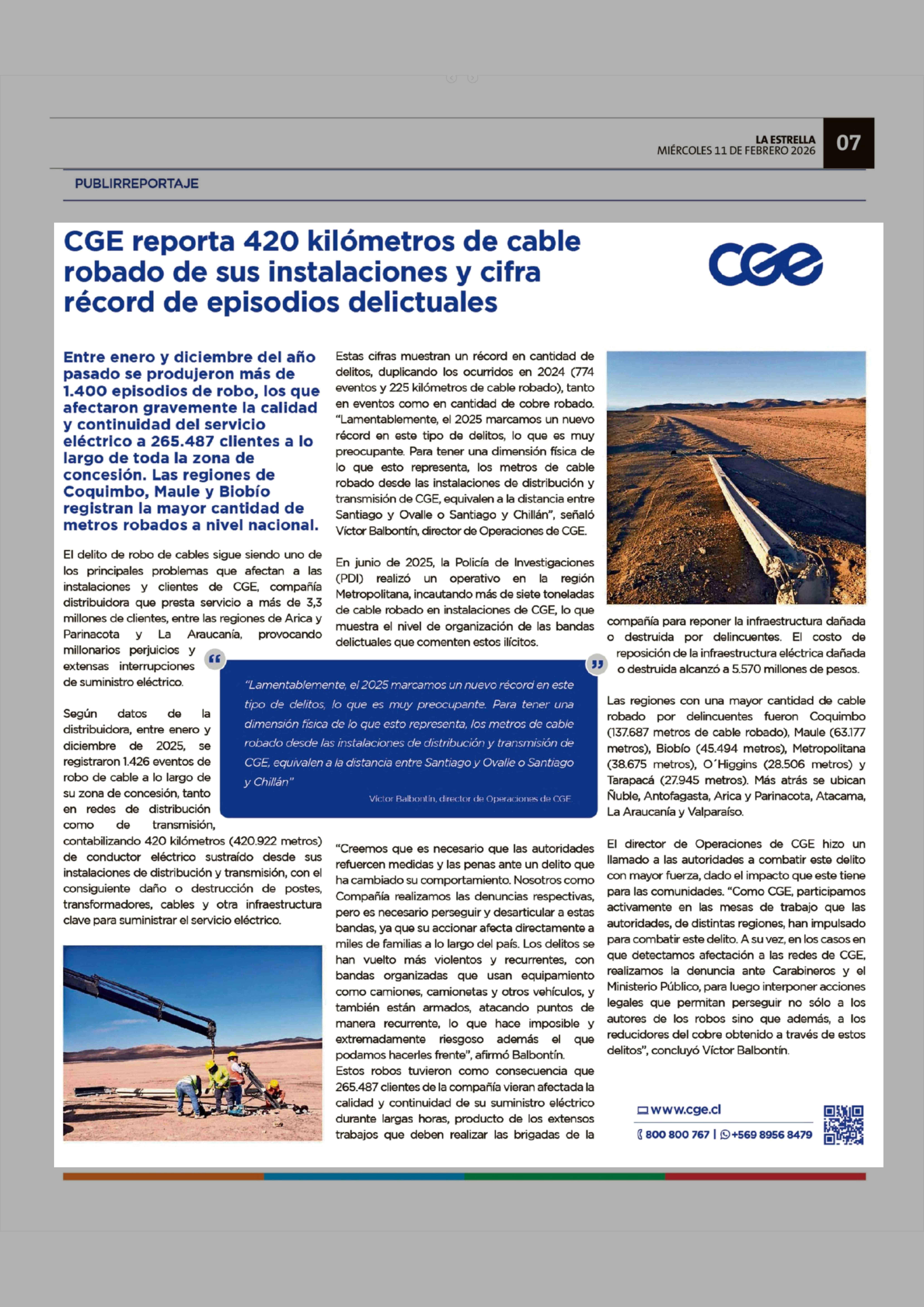 CGE reporta 420 kilómetros de cable robado de sus instalaciones y cifra récord de episodios delictuales 11-02-2026 La Estrella de Valparaíso |