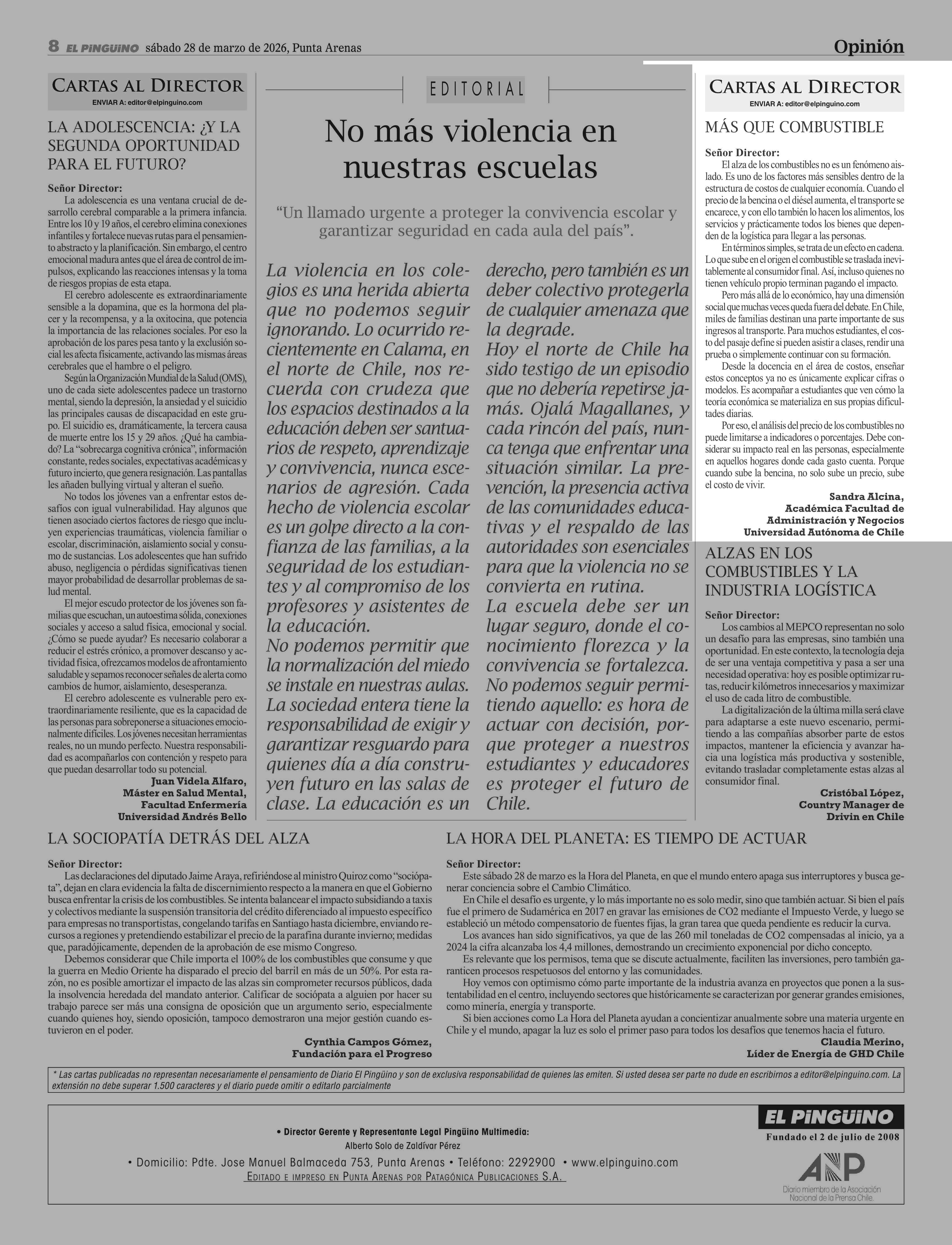 CARTAS: MÁS QUE COMBUSTIBLE 28-03-2026 El Pingüino |
