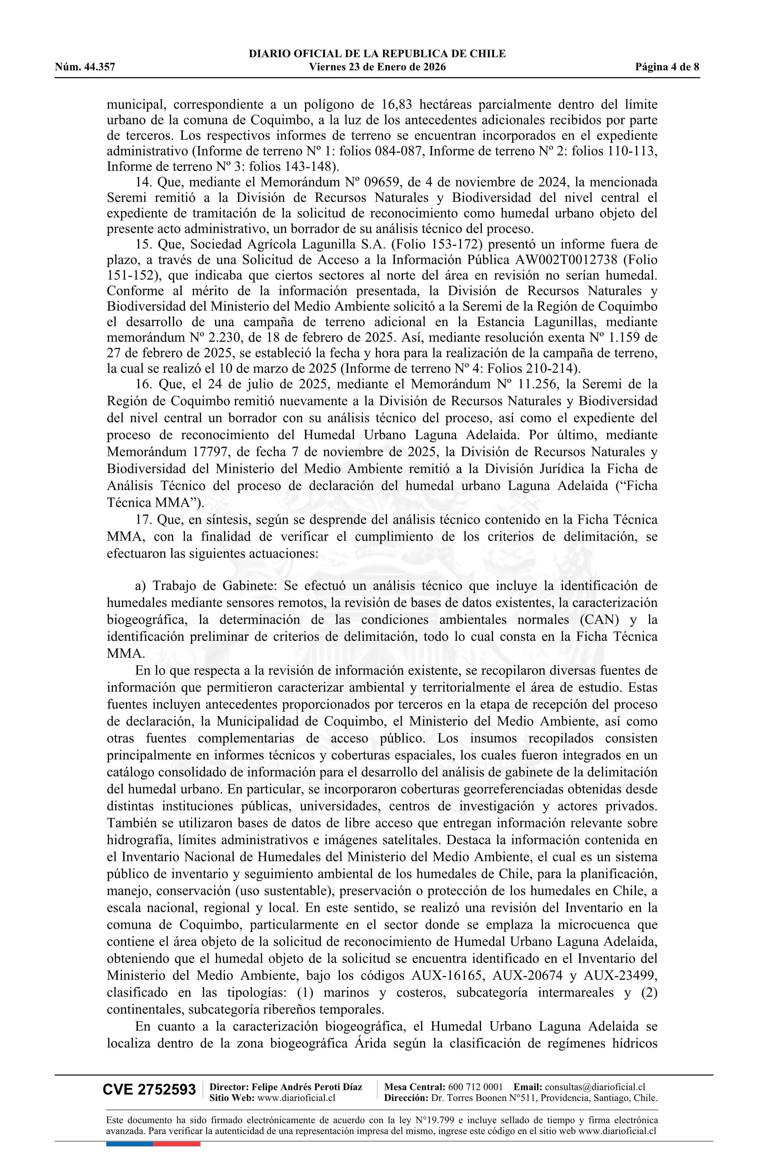 Resolución exenta número 9.516, de 2025.- Reconoce, por solicitud municipal, humedal urbano Laguna Adelaida 23-01-2026 DIARIO OFICIAL CHILE - BOLETÍN OFICIAL DE MINERÍA |