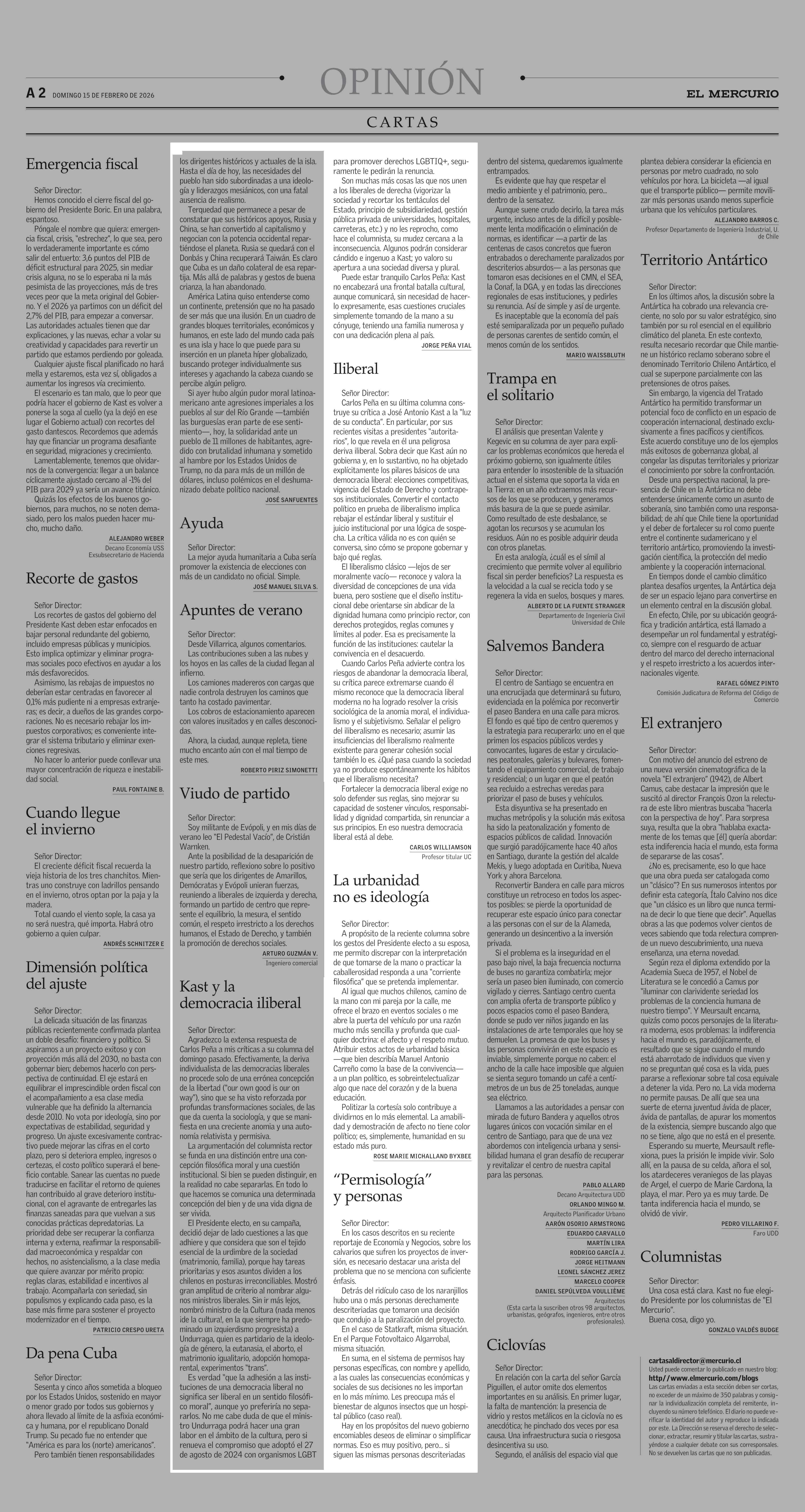 CARTAS: Kast y la democracia iliberal 15-02-2026 El Mercurio |