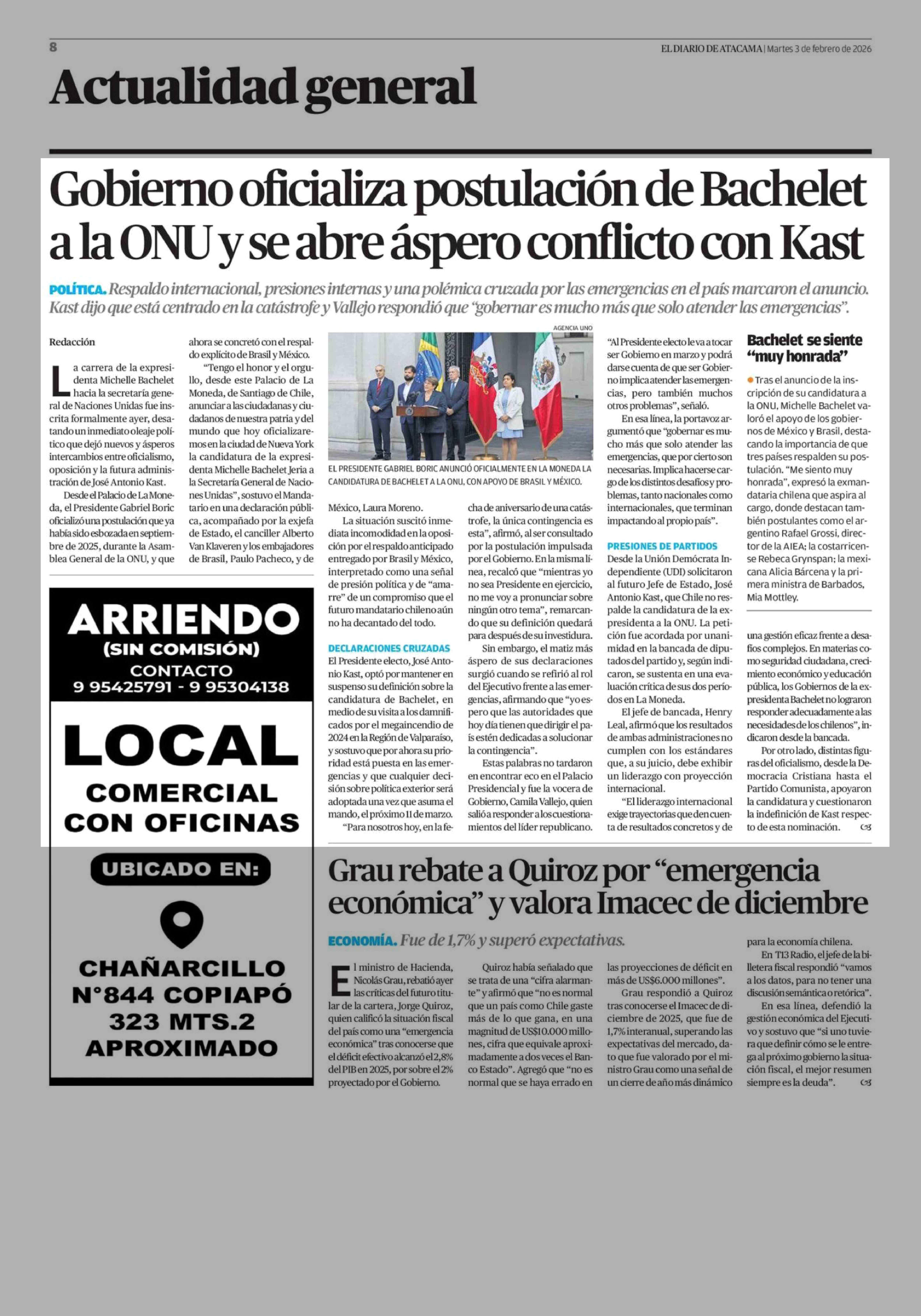 Gobierno oficializa postulación de Bachelet a la ONU y se abre áspero conflicto con Kast 03-02-2026 El Diario de Atacama |