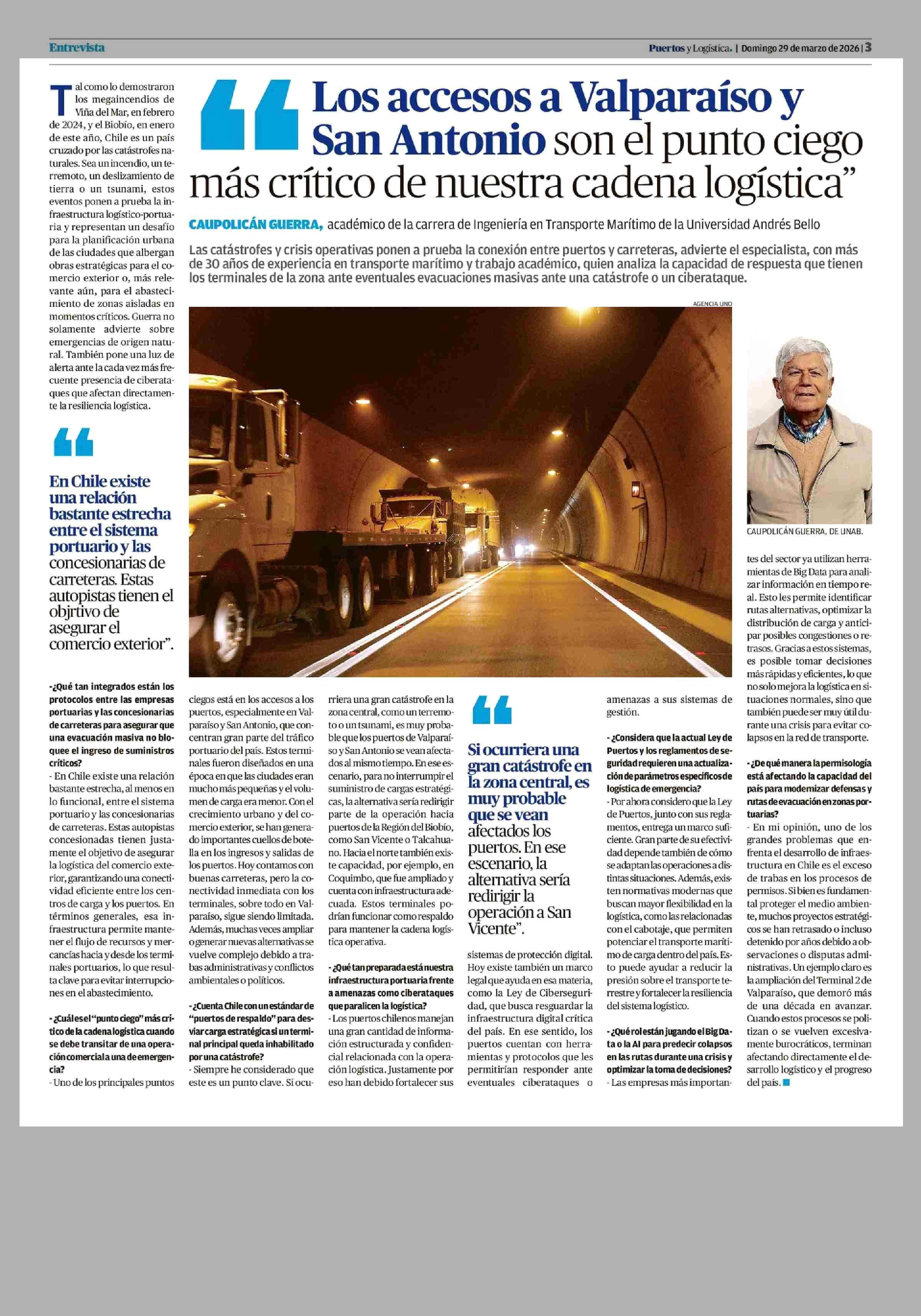 | Título: | Los accesos a Valparaíso y San Antonio son el punto ciego más crítico de nuestra cadena logística” CAUPOLICÁN GUERRA, académico de la carrera de Ingeniería en Transporte Marítimo de la Universidad Andrés Bello Las catástrofes y crisis operativas ponen a prueba la conexión entre puertos y carreteras, |
