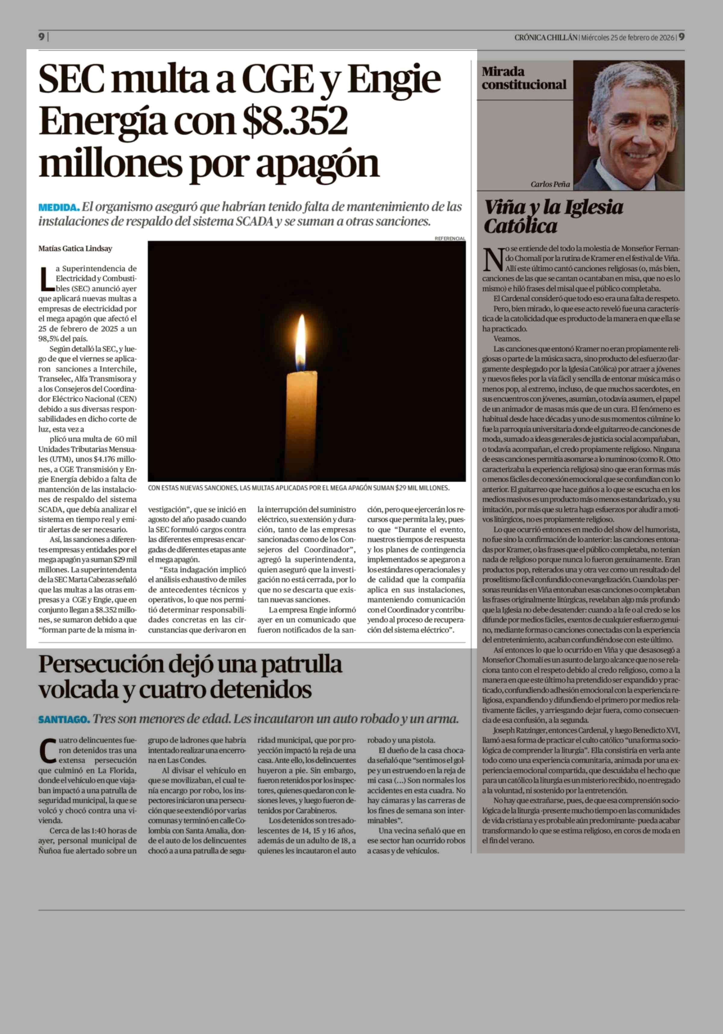 SEC multa a CGE y Engie Energía con $8.352 millones por apagón 25-02-2026 Crónica de Chillán |
