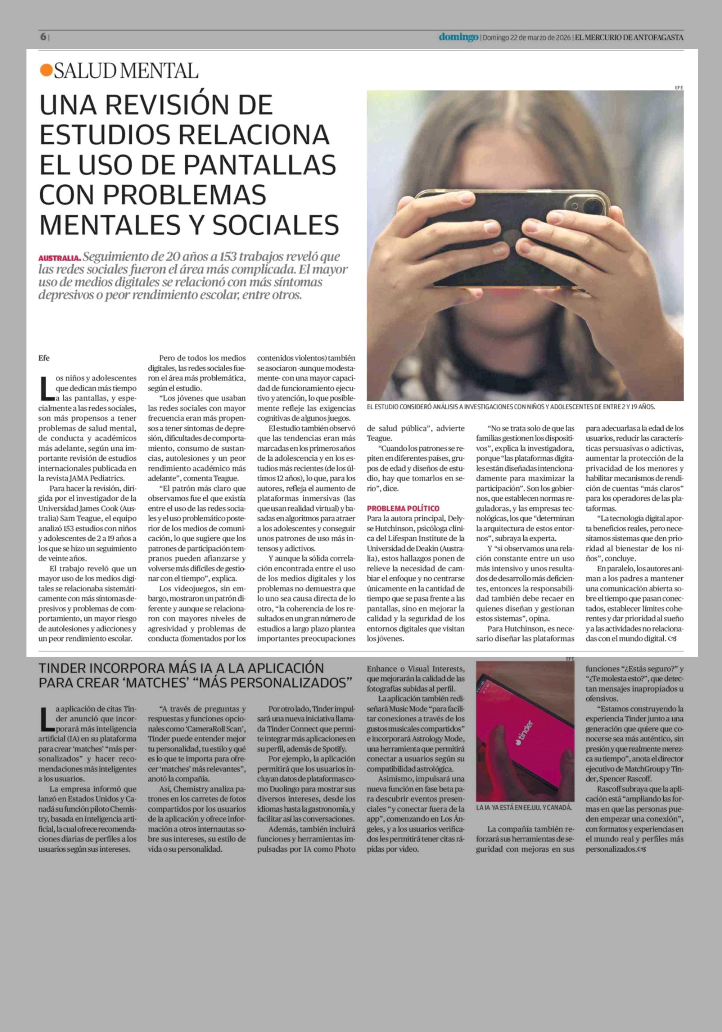 UNA REVISIÓN DE ESTUDIOS RELACIONA EL USO DE PANTALLAS CON PROBLEMAS MENTALES Y SOCIALES 22-03-2026 El Mercurio de Antofagasta |