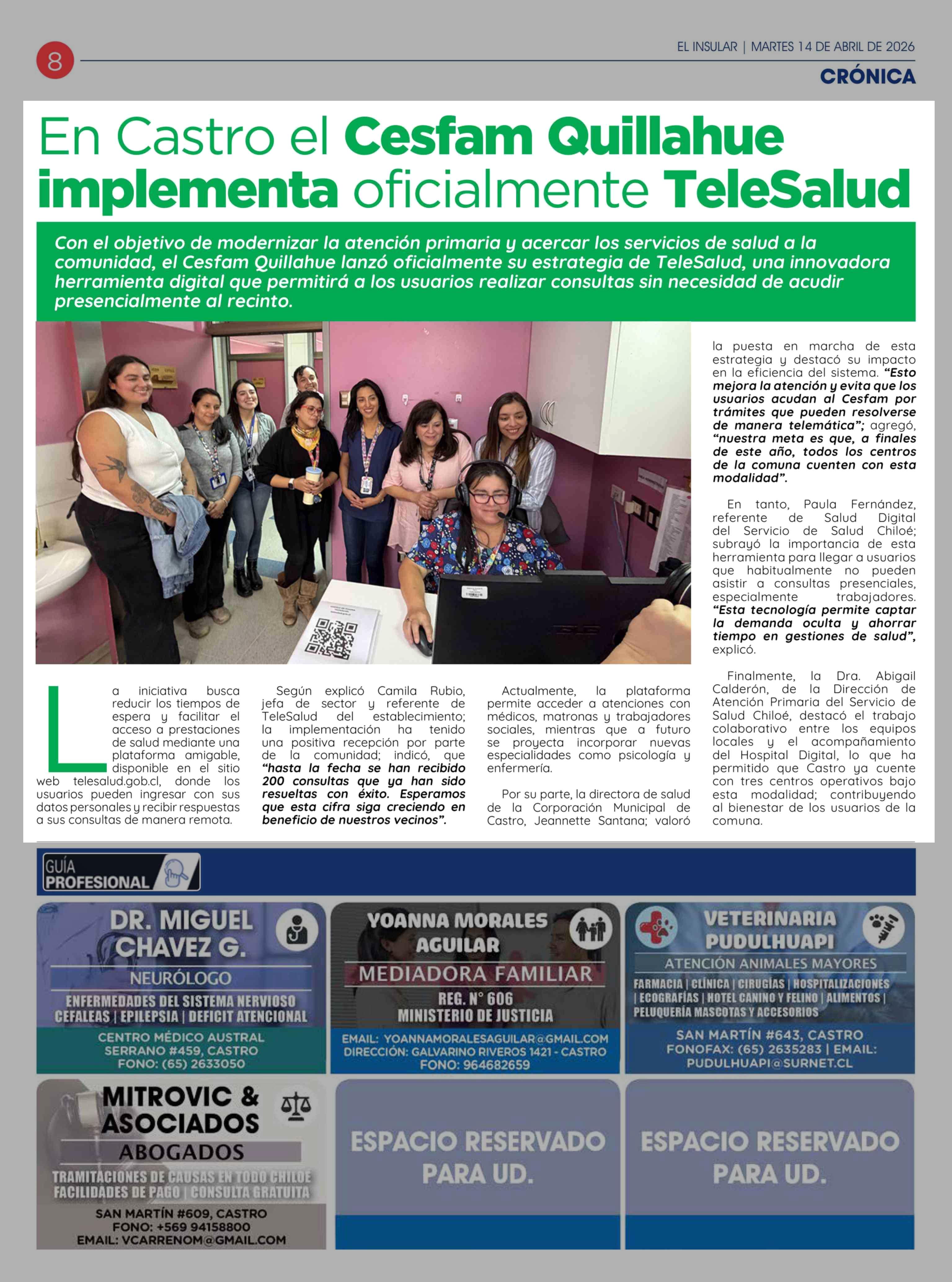 En Castro el Cesfam Quillahue implementa oficialmente TeleSalud 14-04-2026 El Insular |