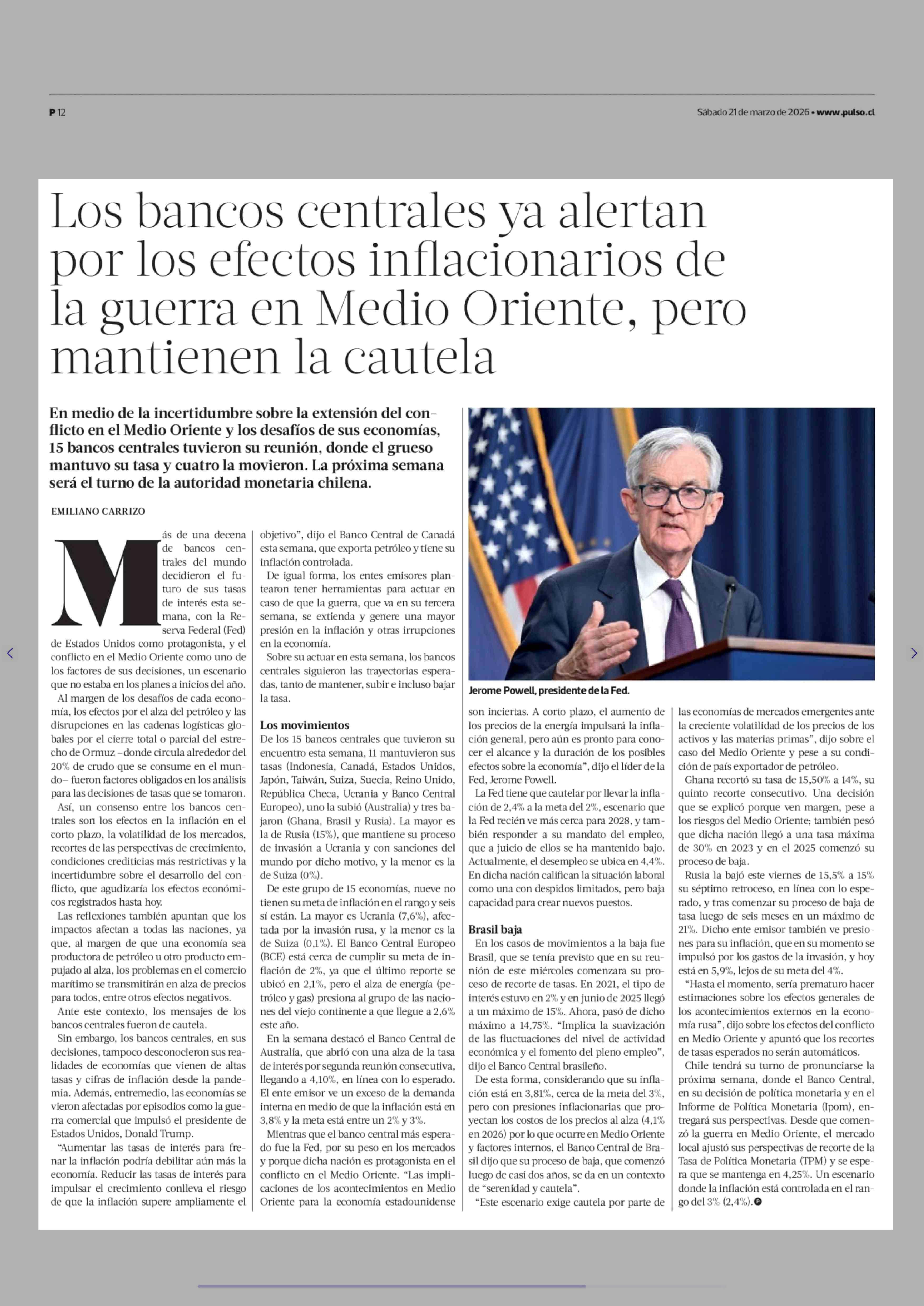 Los bancos centrales ya alertan por los efectos inflacionarios de la guerra en Medio Oriente, pero mantienen la cautela 21-03-2026 La Tercera |