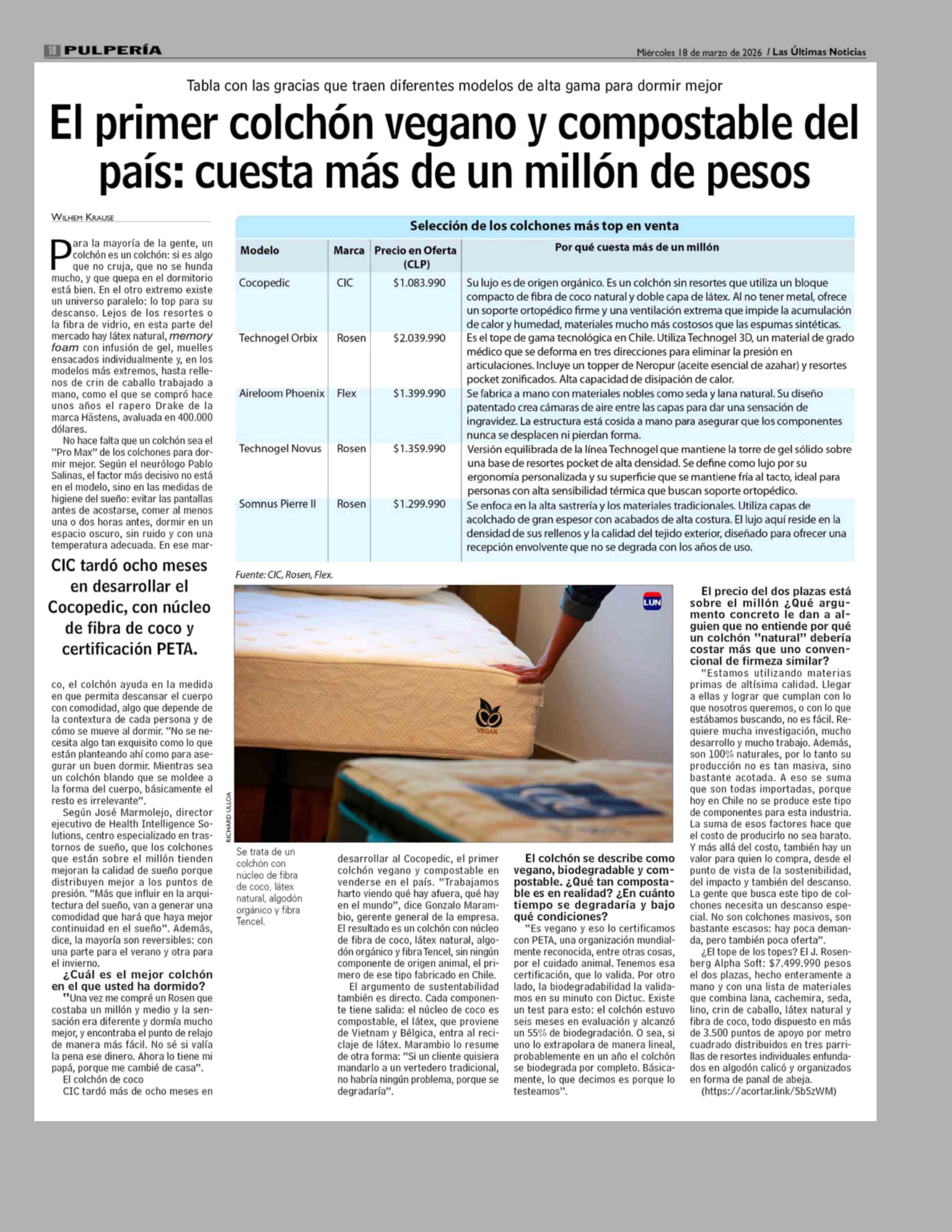 El primer colchón vegano y compostable del país: cuesta más de un millón de pesos 18-03-2026 Las Últimas Noticias |