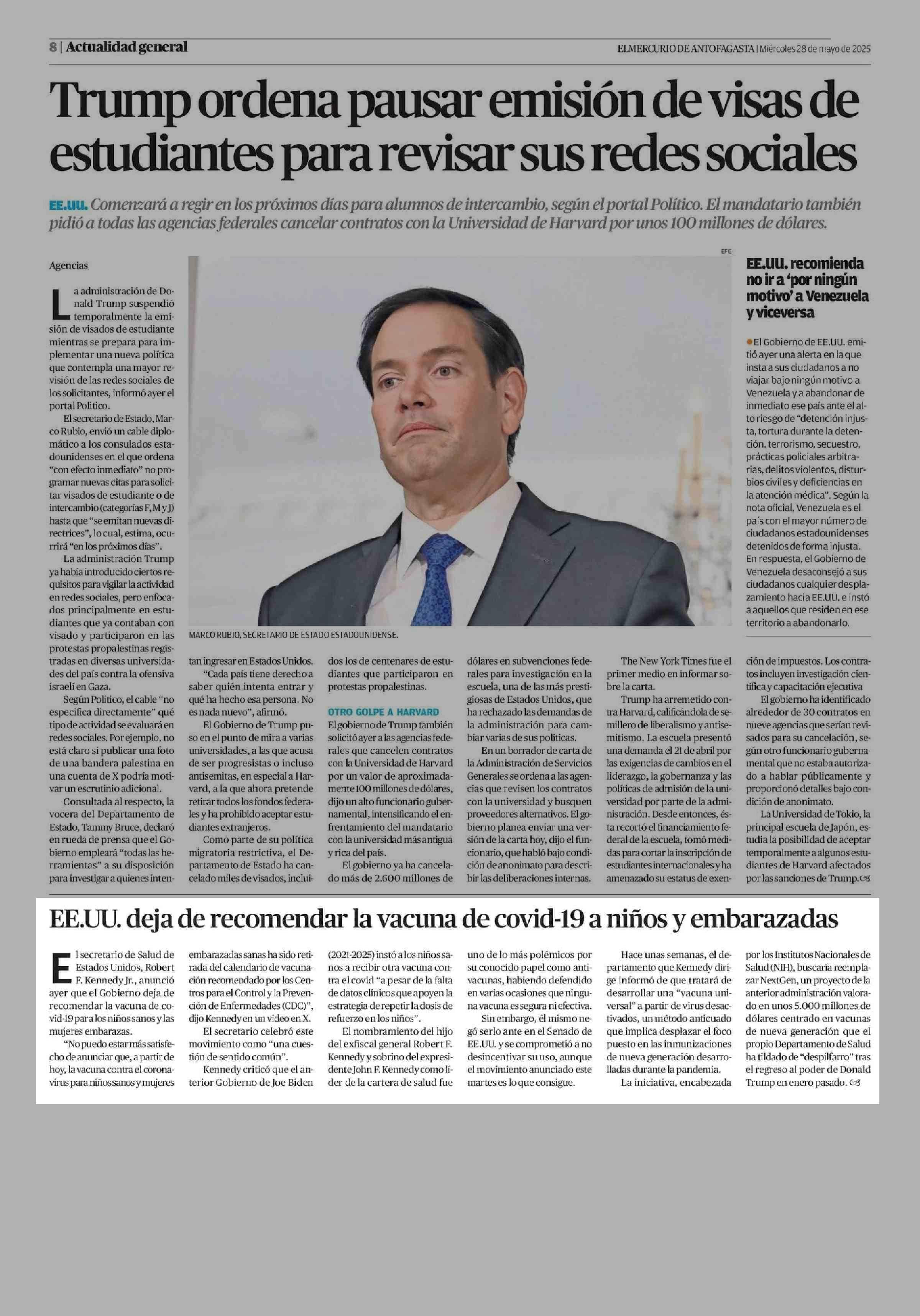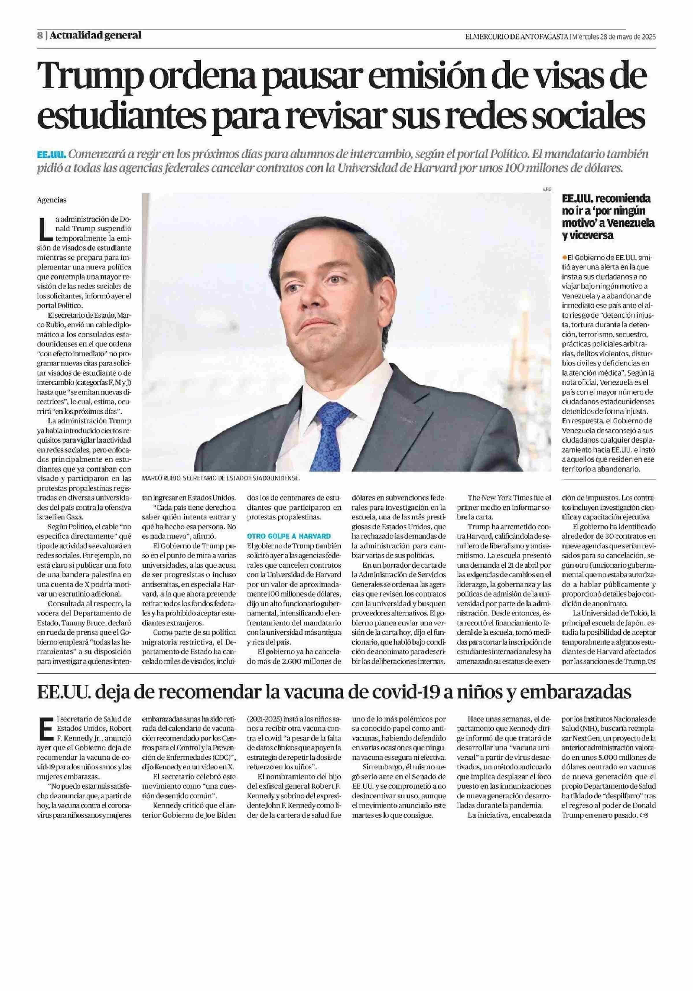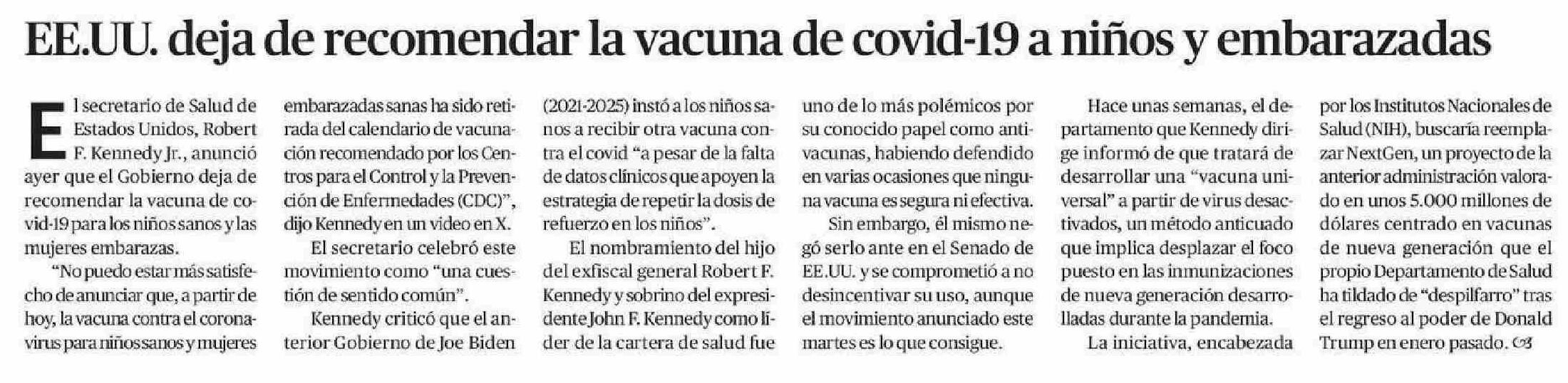EE.UU. deja de recomendar la vacuna de covid-19 a niños y embarazadas 28-05-2025 El Mercurio de Antofagasta |