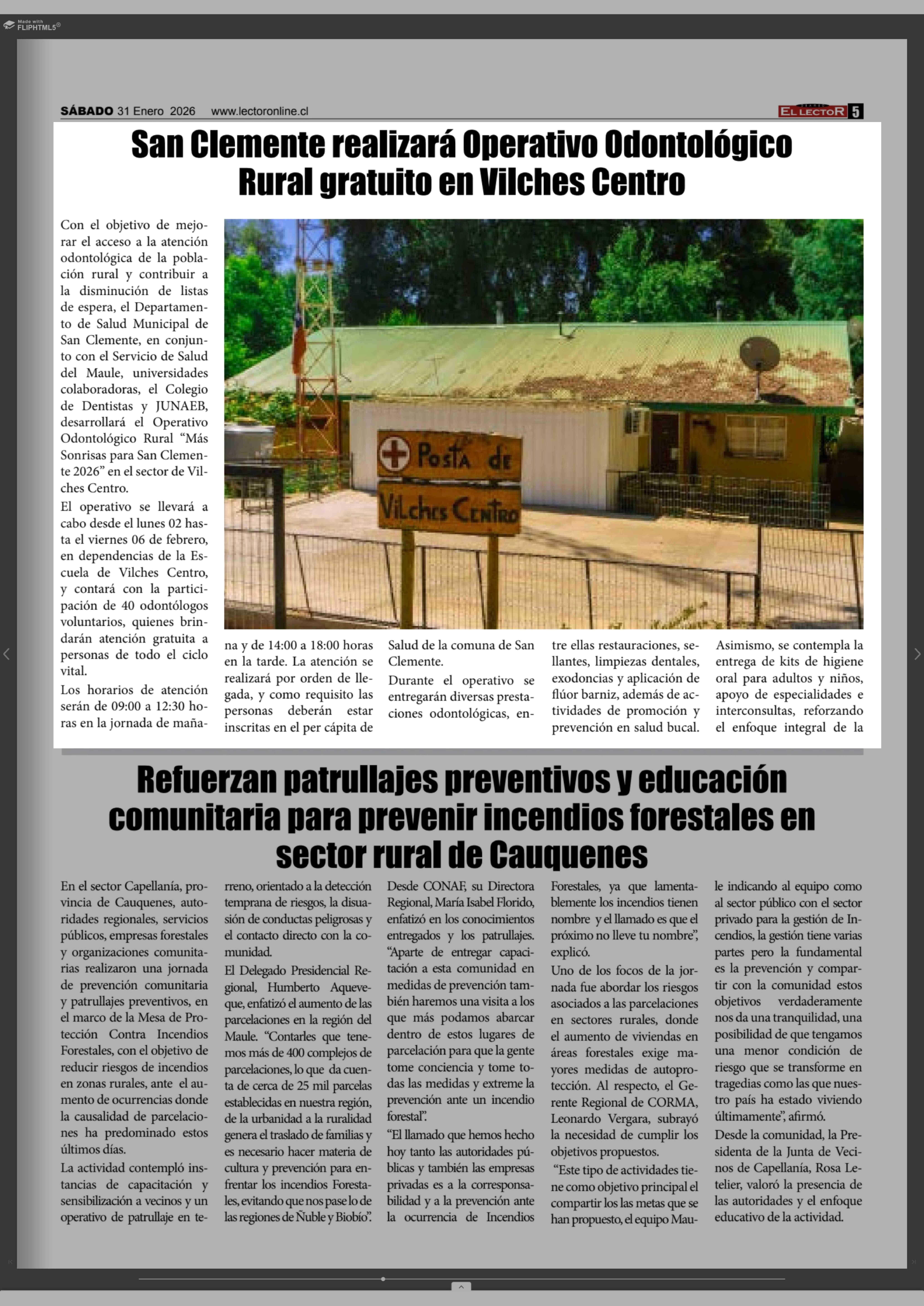 San Clemente realizará Operativo Odontológico Rural gratuito en Vilches Centro 31-01-2026 El Lector |