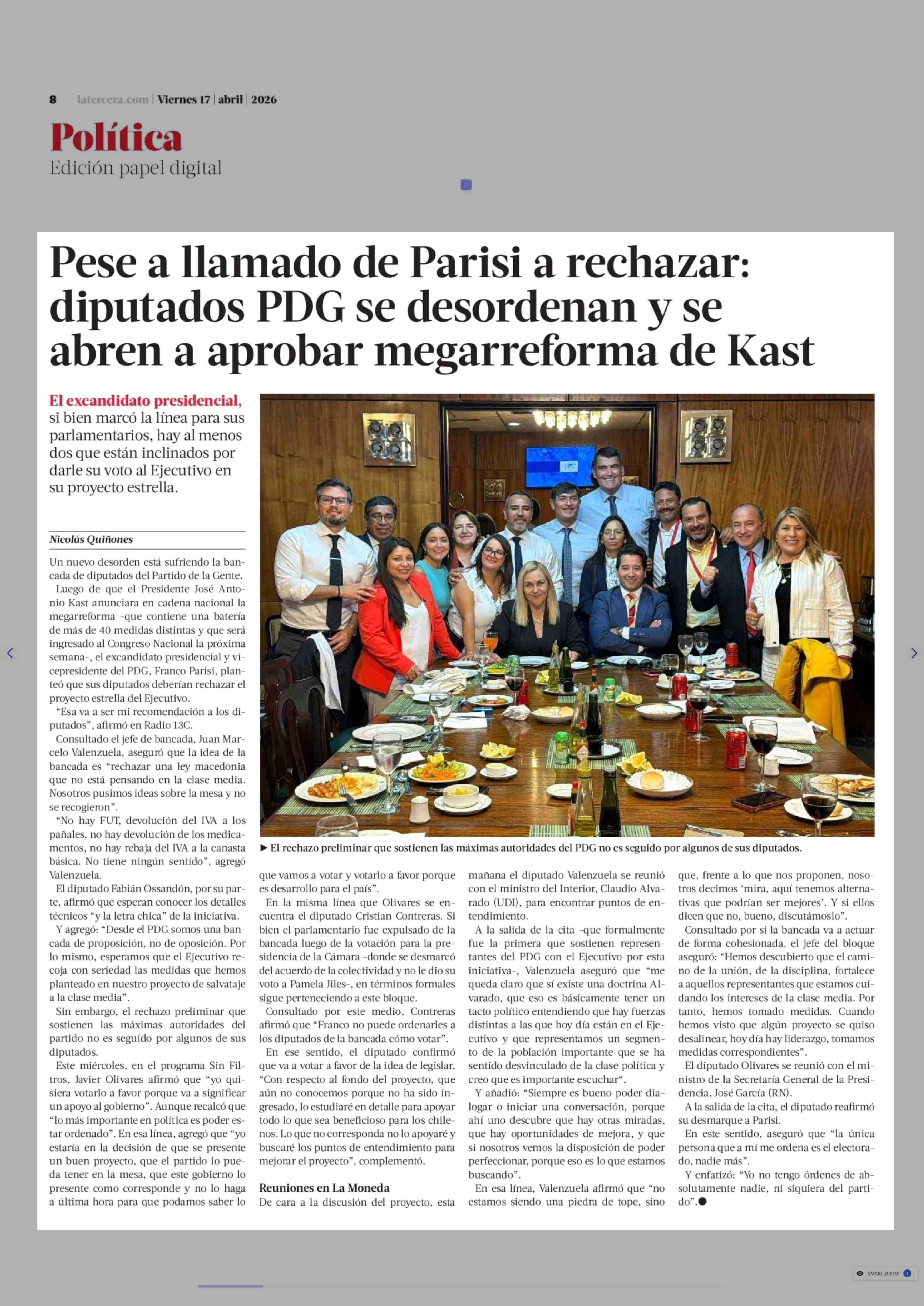Pese a llamado de Parisi a rechazar: diputados PDG se desordenan y se abren a aprobar megarreforma de Kast 17-04-2026 La Tercera |