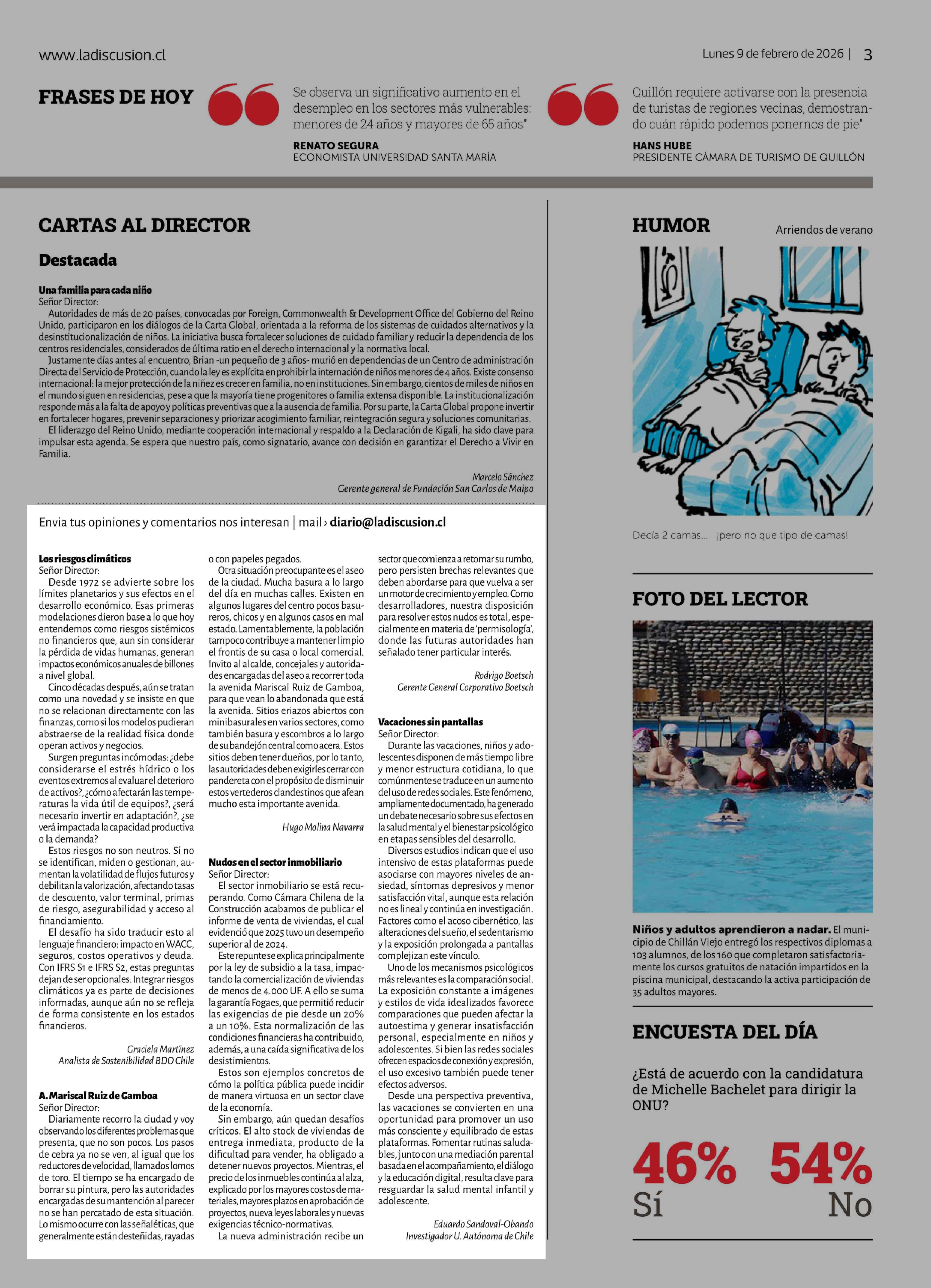 | Título: | Los riesgos climáticos Señor Director: Desde 1972 se advierte sobre los límites planetarios y sus efectos en el desarrollo económico. Esas primeras modelaciones dieron base a lo que hoy entendemos como riesgos sistémicos no financieros que, aun sin considerar la pérdida de vidas humanas, generan imp |