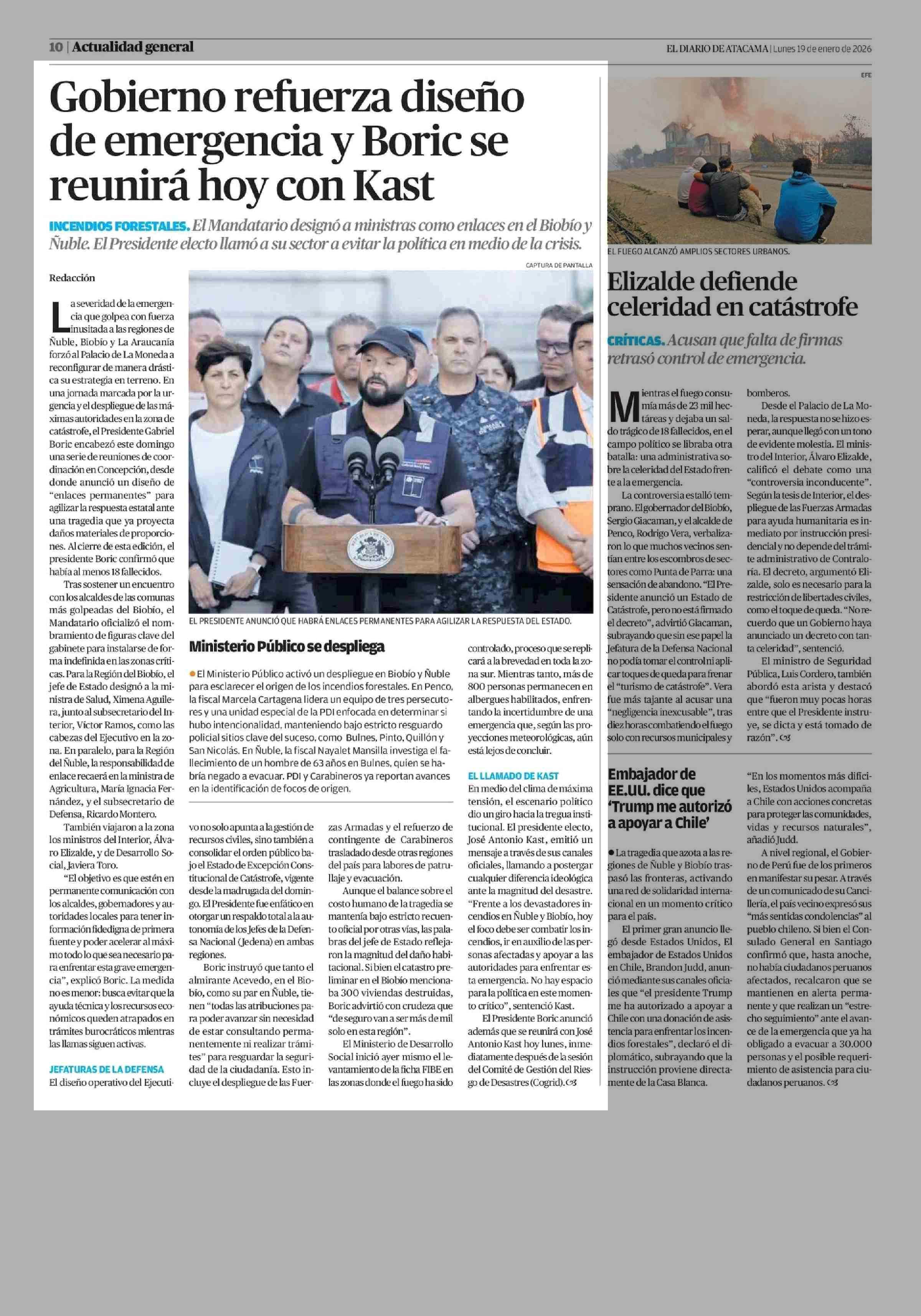 Gobierno refuerza diseño de emergencia y Boric se reunirá hoy con Kast 19-01-2026 El Diario de Atacama |