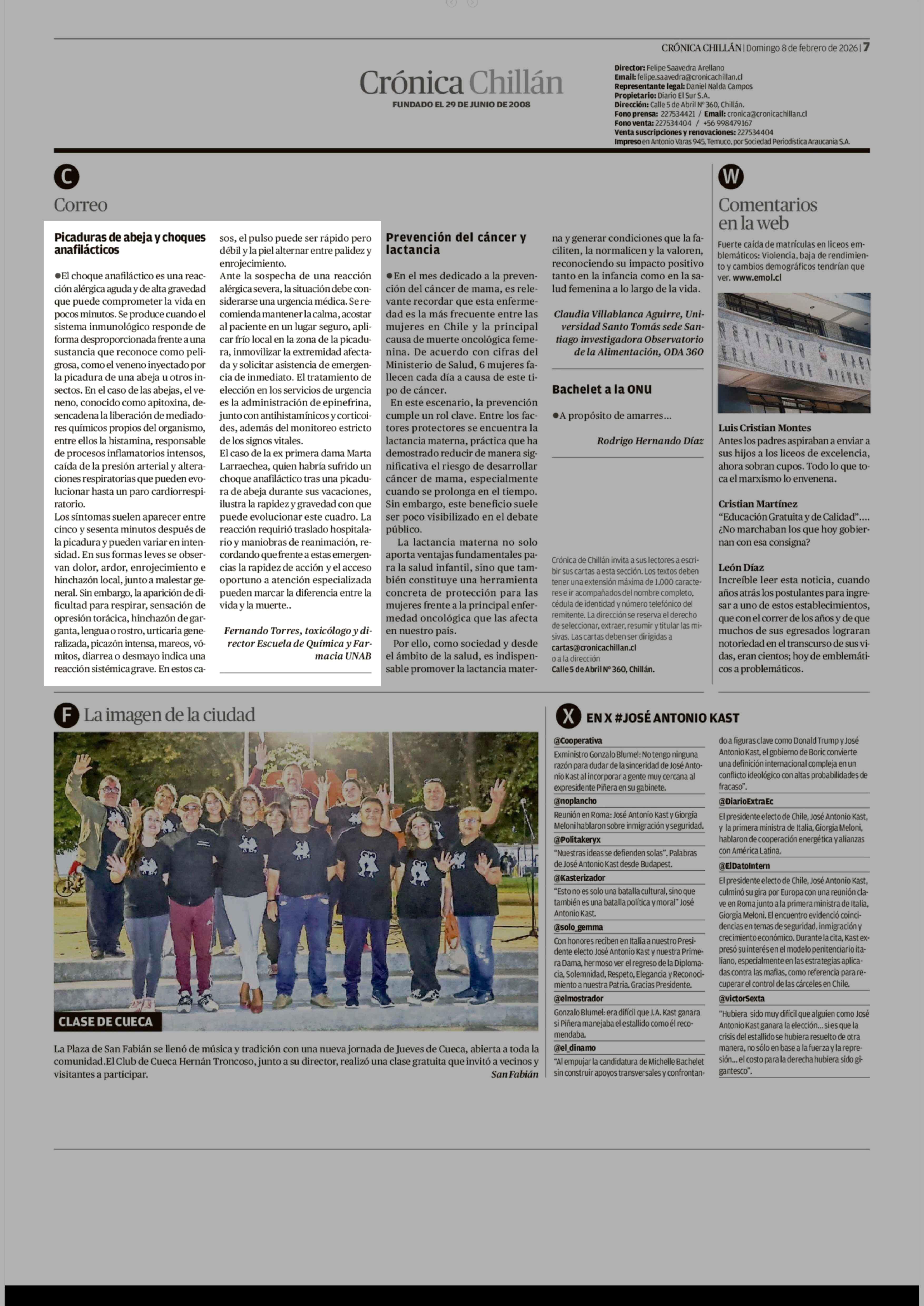 Cartas: Picaduras de abeja y choques anafilácticos 08-02-2026 Crónica de Chillán |