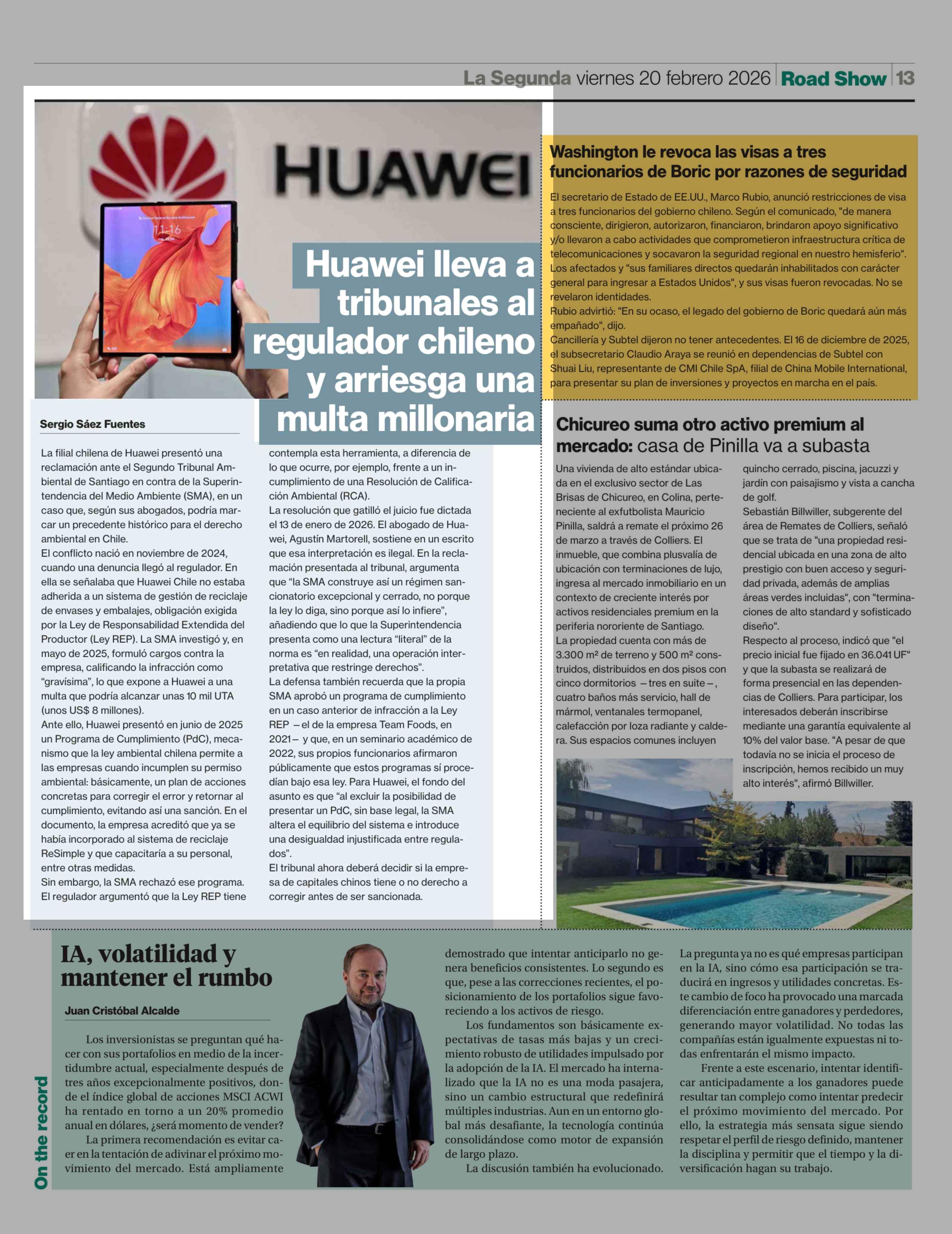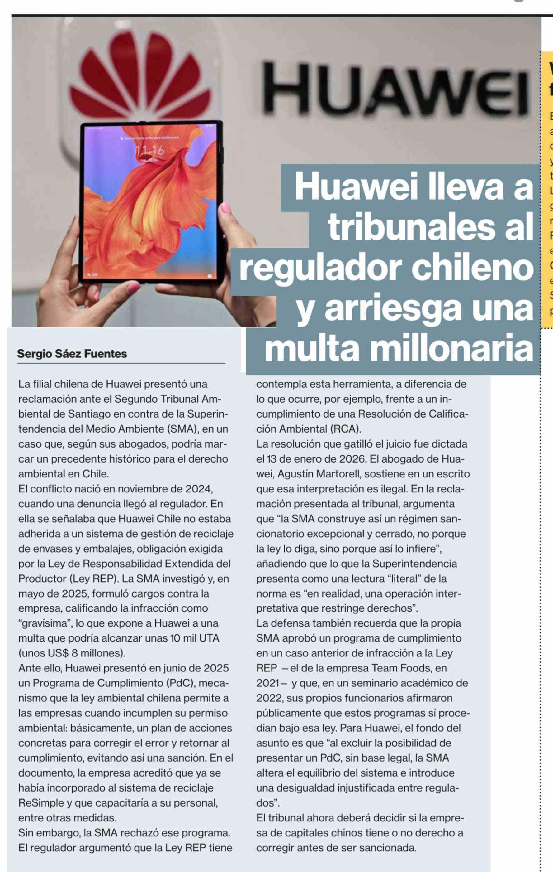 Huawei lleva a tribunales al regulador chileno y arriesga una multa millonaria 20-02-2026 La Segunda |