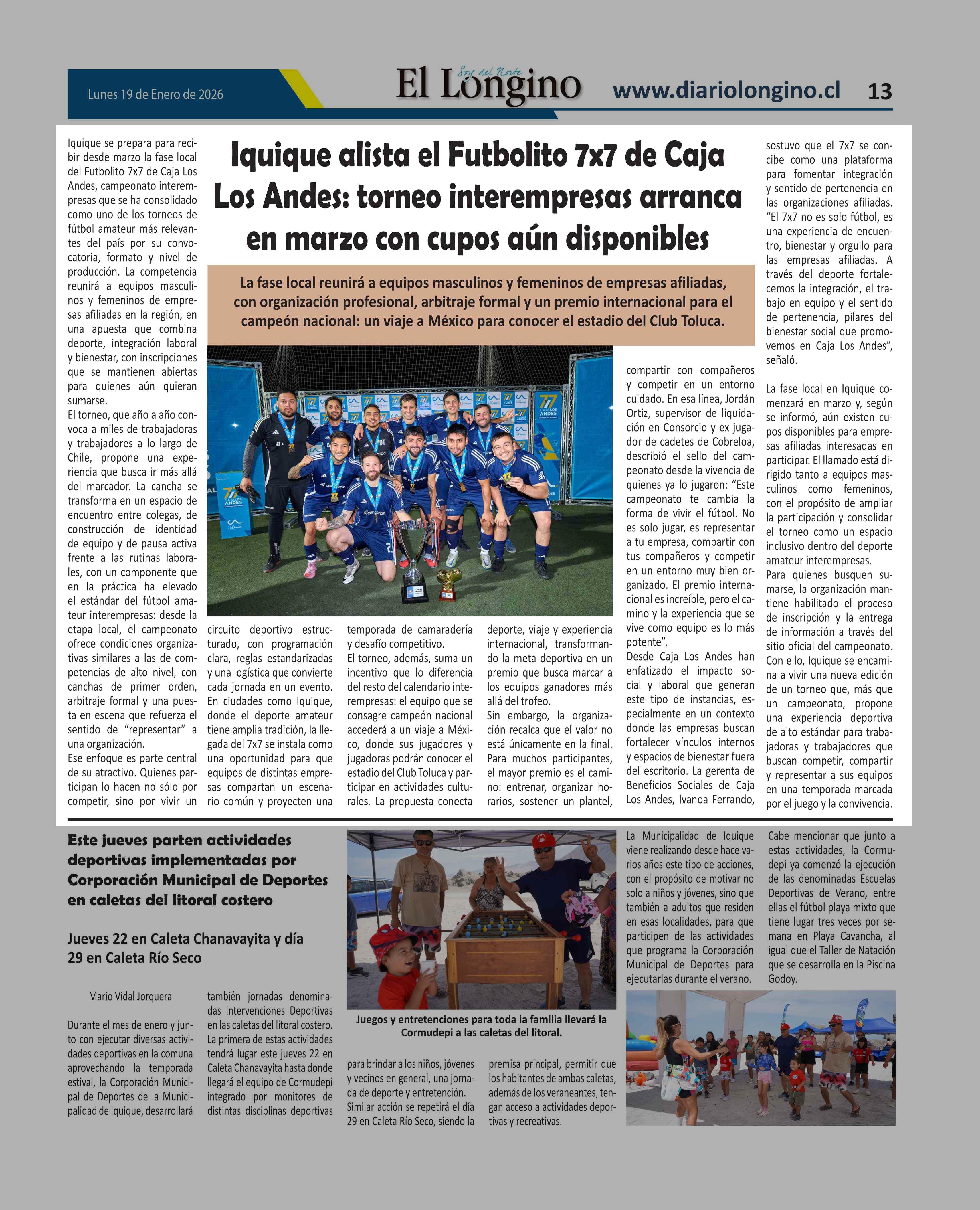 Iquique alista el Futbolito 7x7 de Caja Los Andes: torneo interempresas arranca en marzo con cupos aún disponibles 19-01-2026 El Longino |