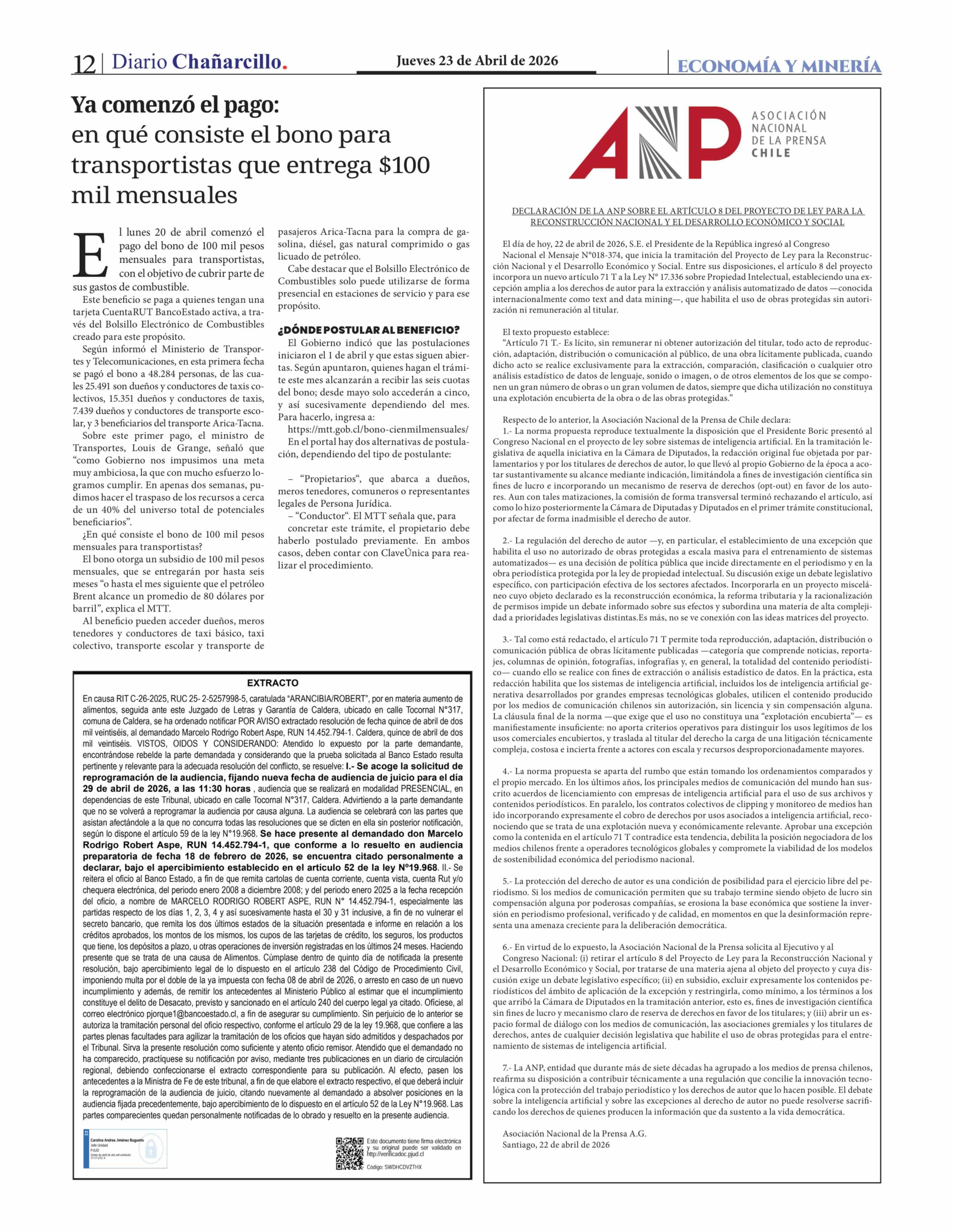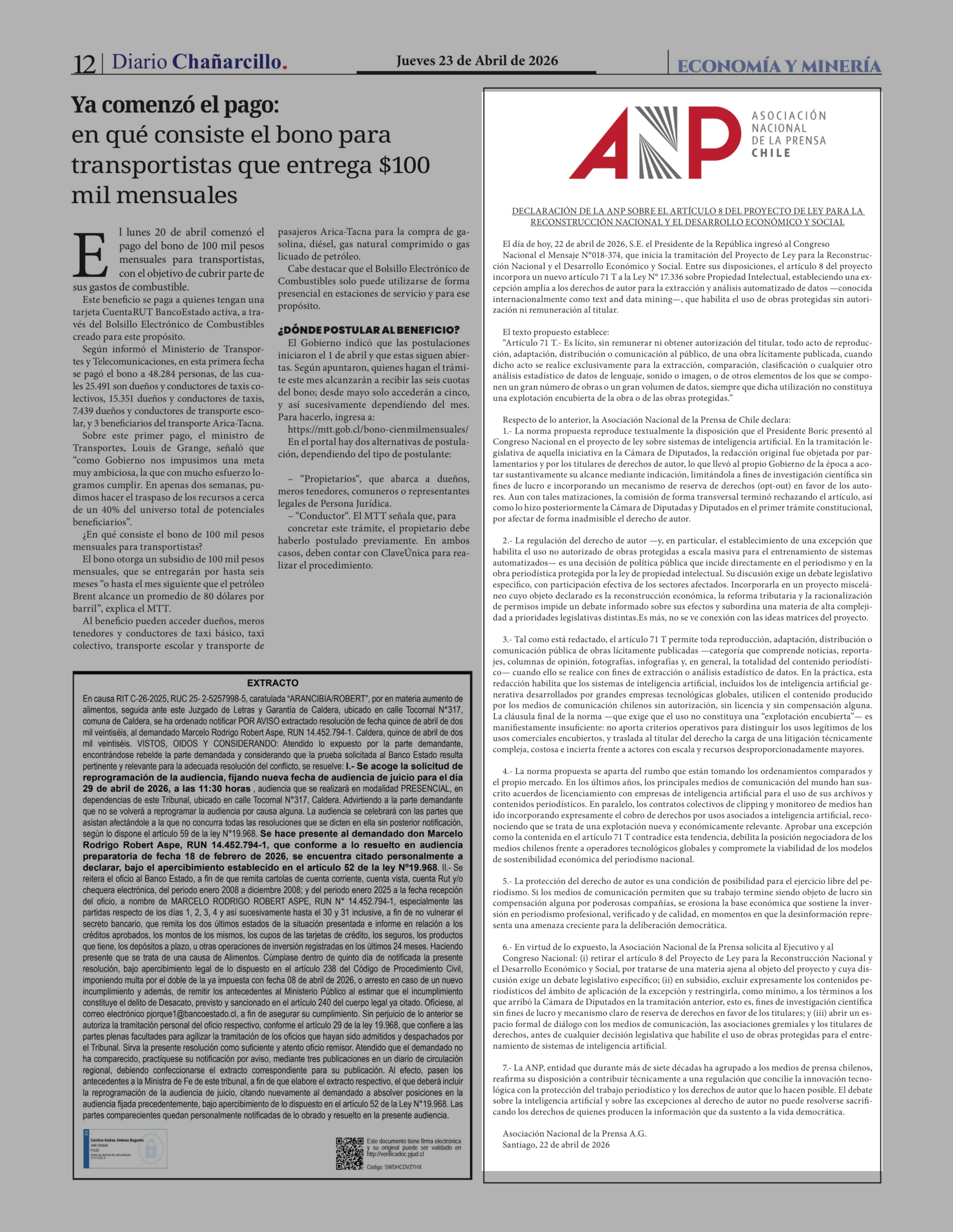 Fuente: Diario Chañarcillo (Diario Chanarcillo) Página(s): 12