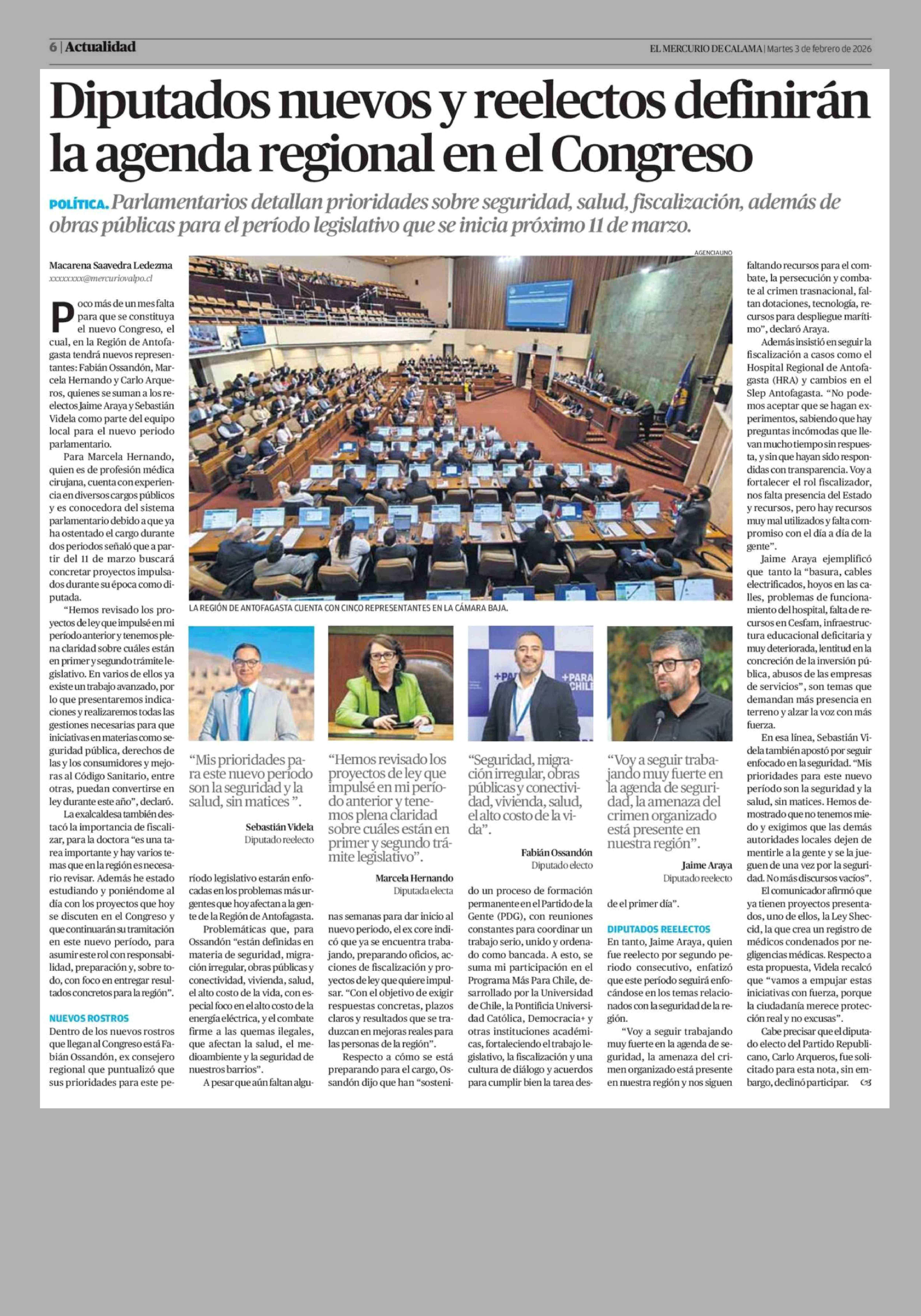 Diputados nuevos y reelectos definirán la agenda regional en el Congreso 03-02-2026 El Mercurio de Calama |