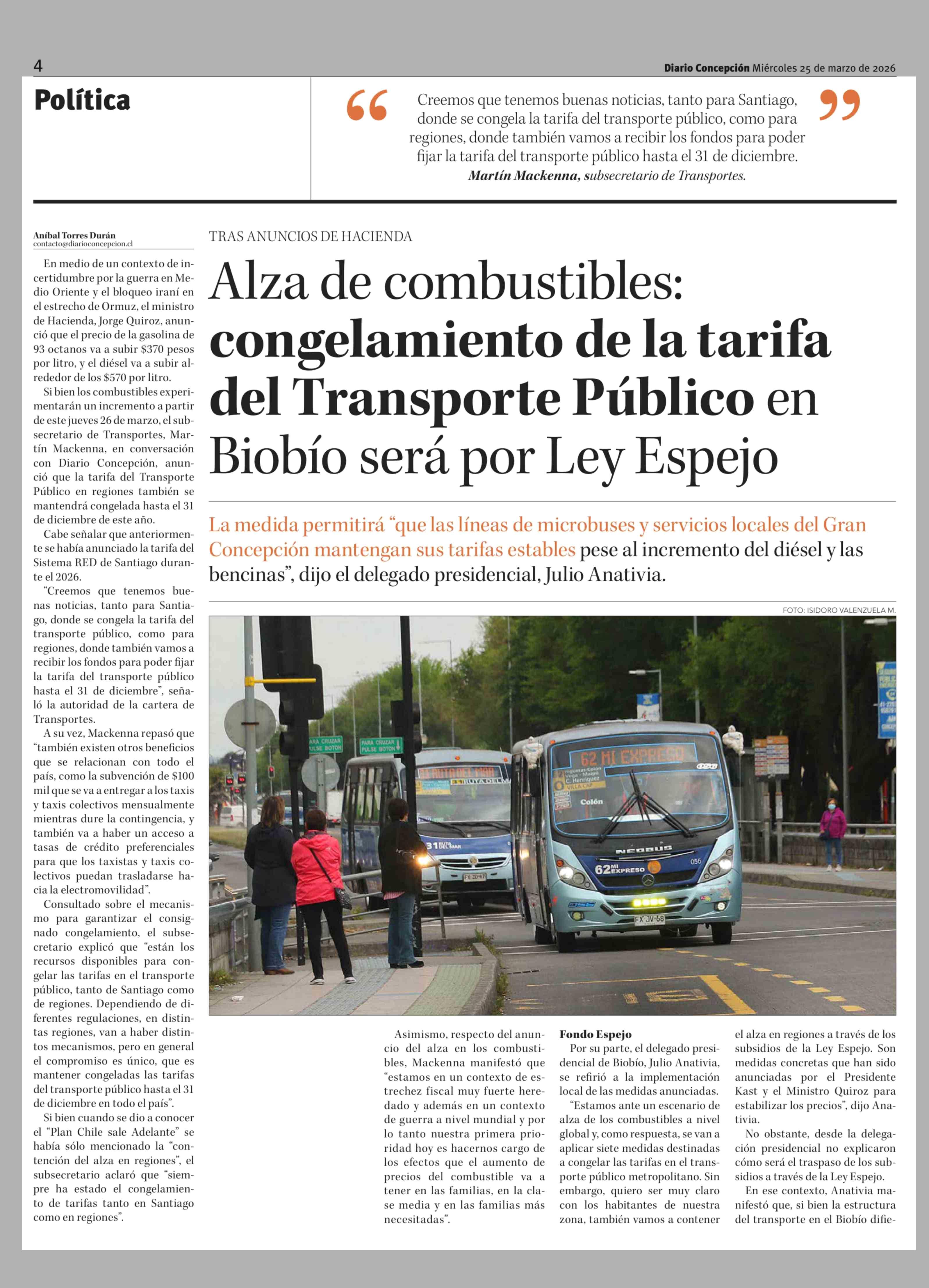 Título: Alza de combustibles: congelamiento de la tarifa del Transporte Público en Biobío será por Ley Espejo