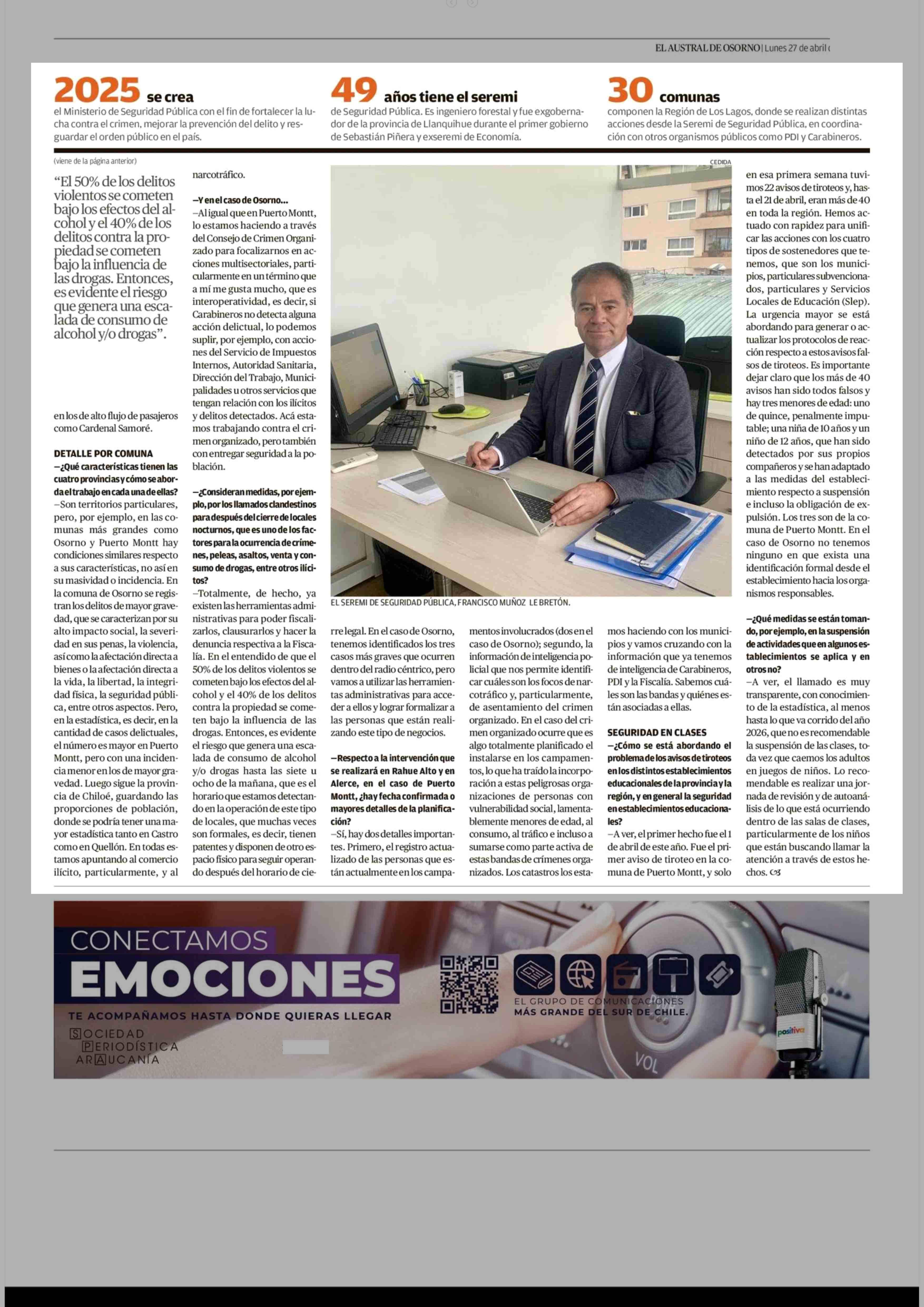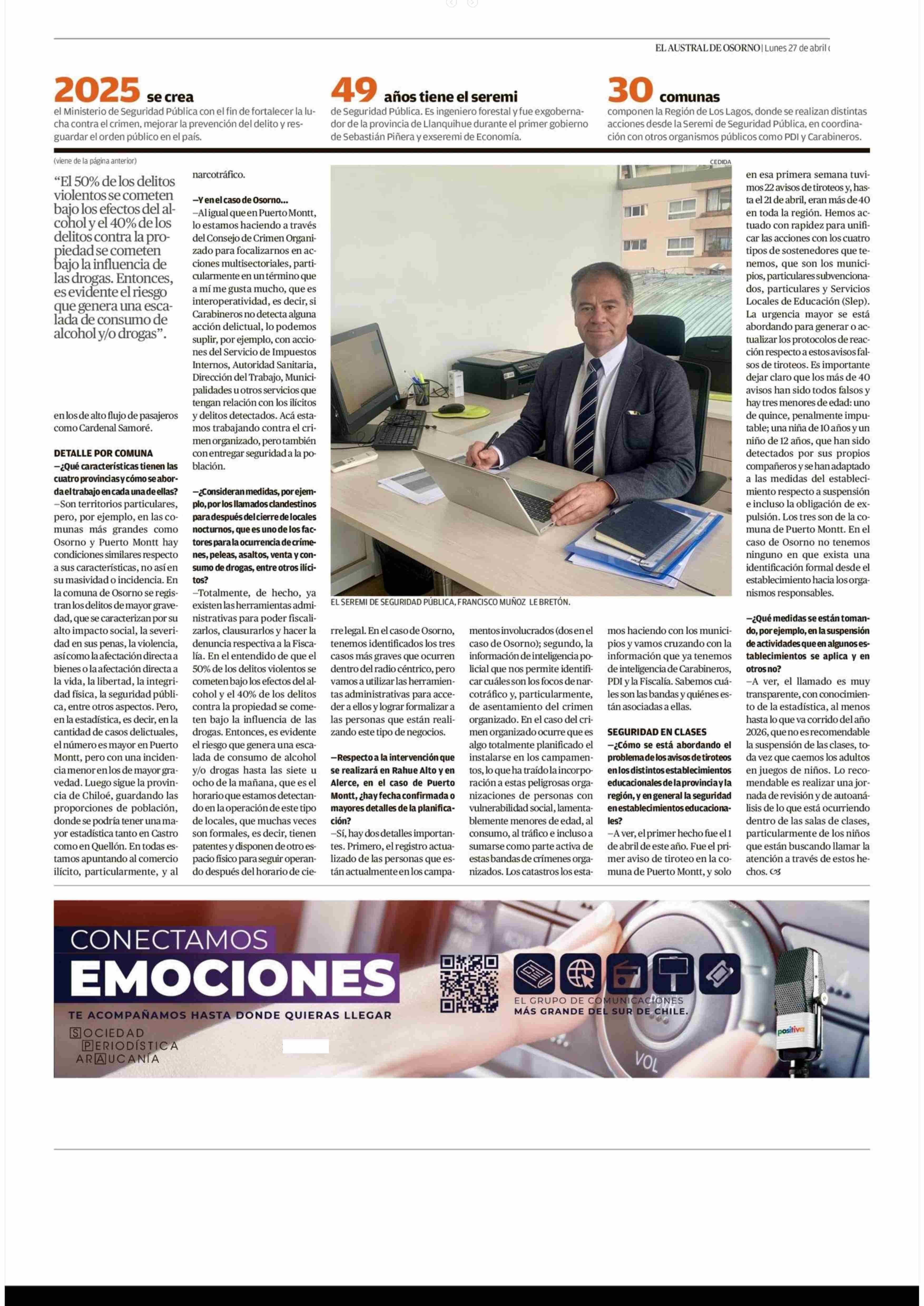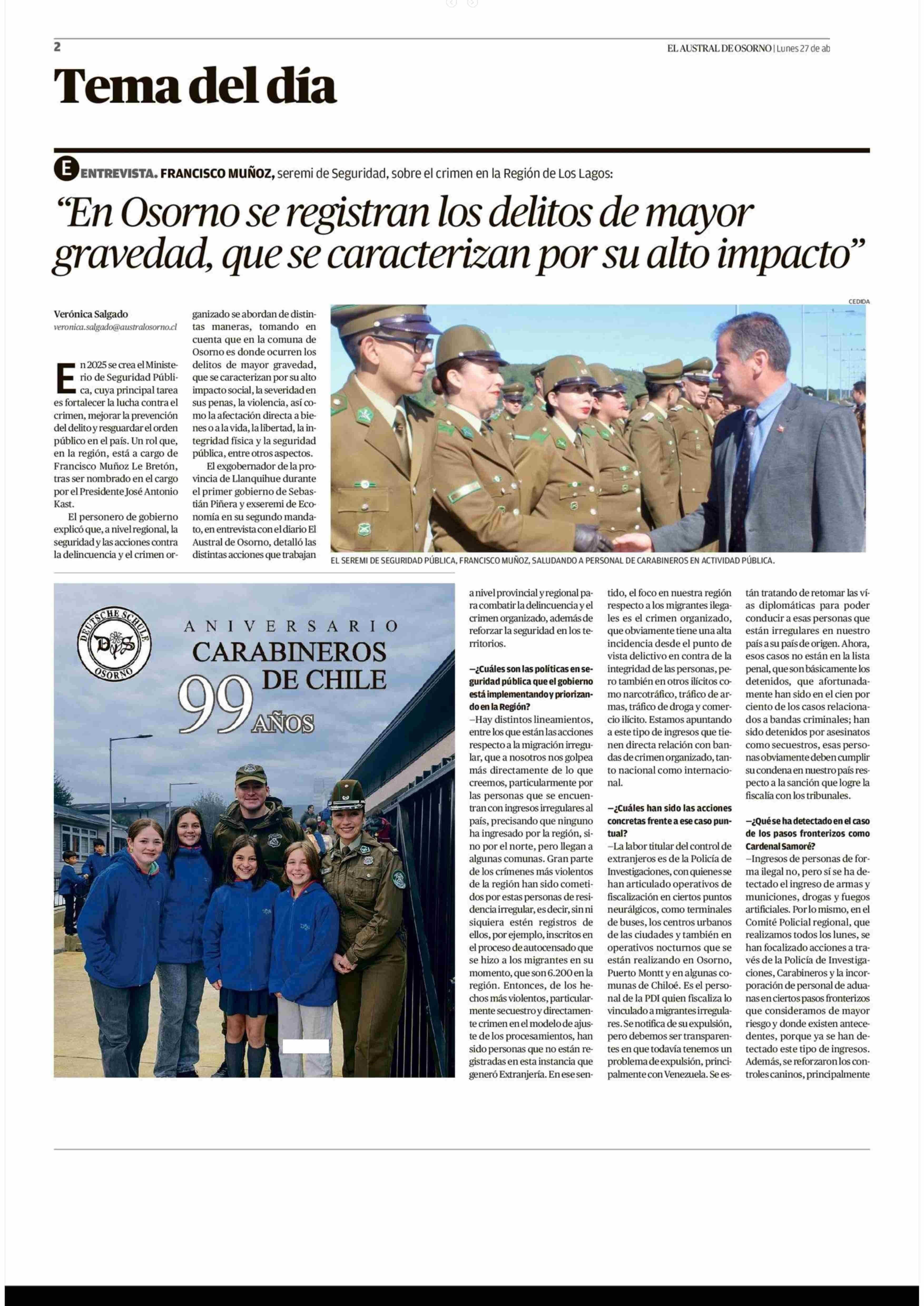 "En Osorno se registran los delitos de mayor gravedad, que se caracterizan por su alto impacto" 27-04-2026 El Austral de Osorno |