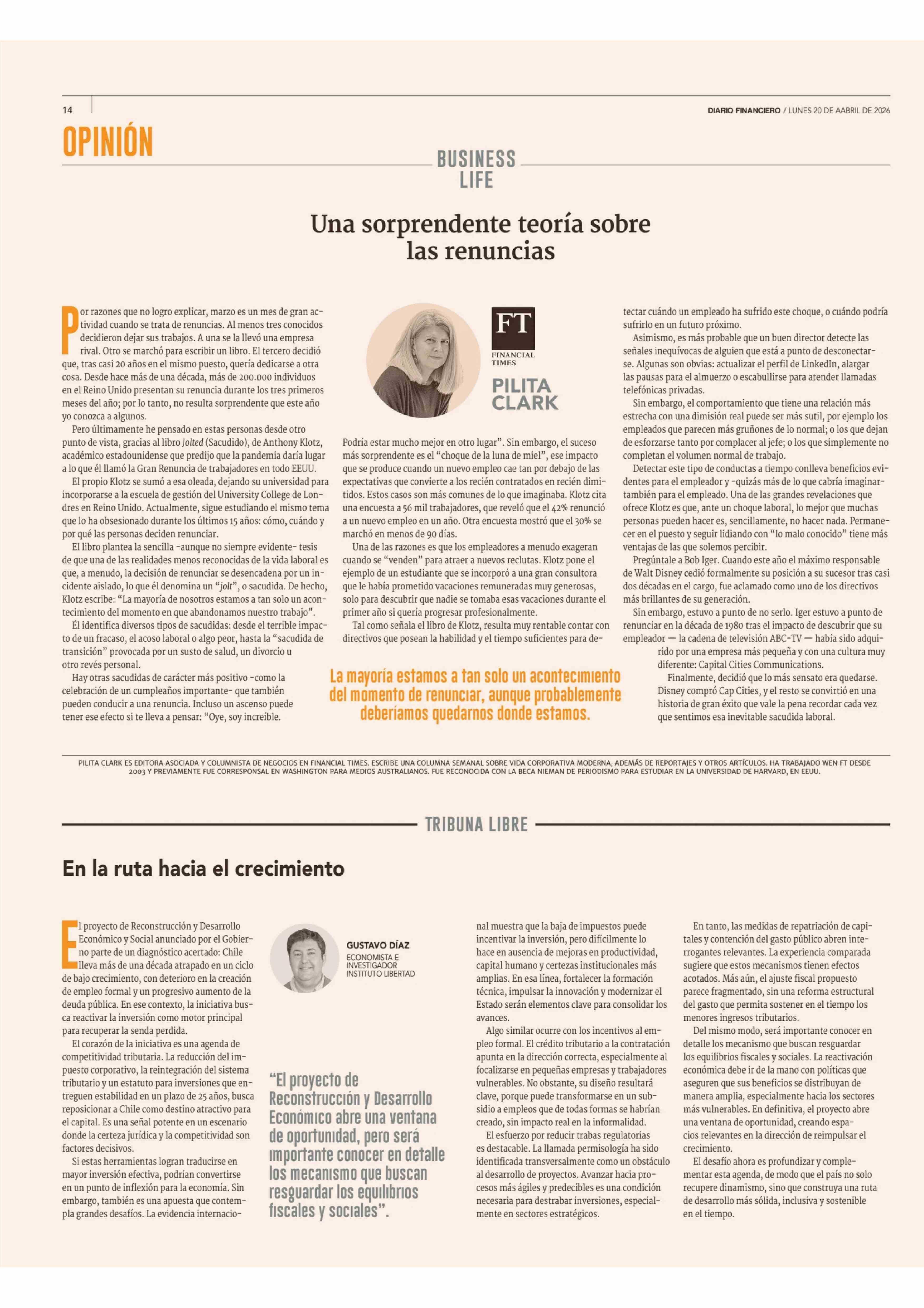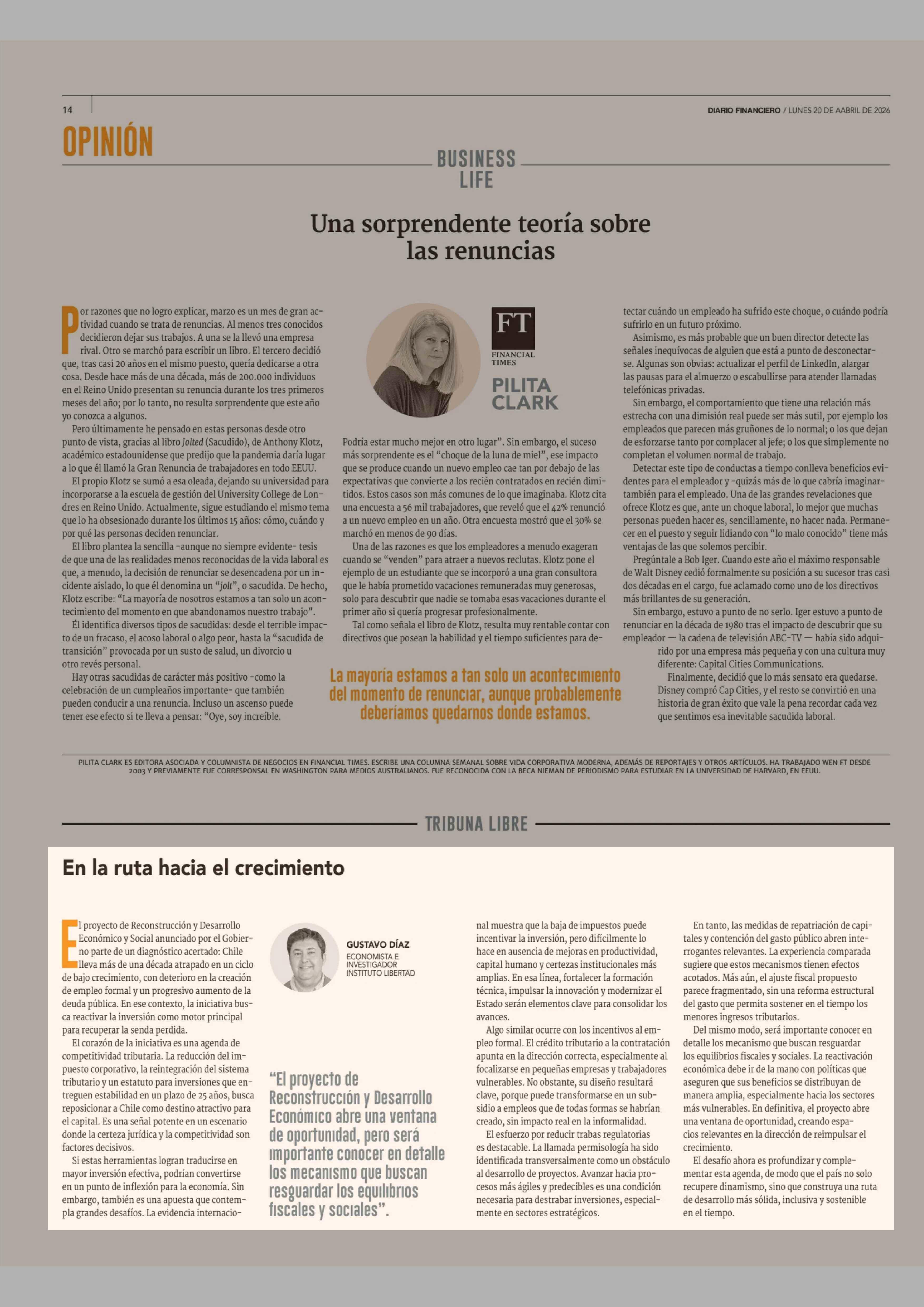 Columnas de Opinión: En la ruta hacia el crecimiento 20-04-2026 Diario Financiero |