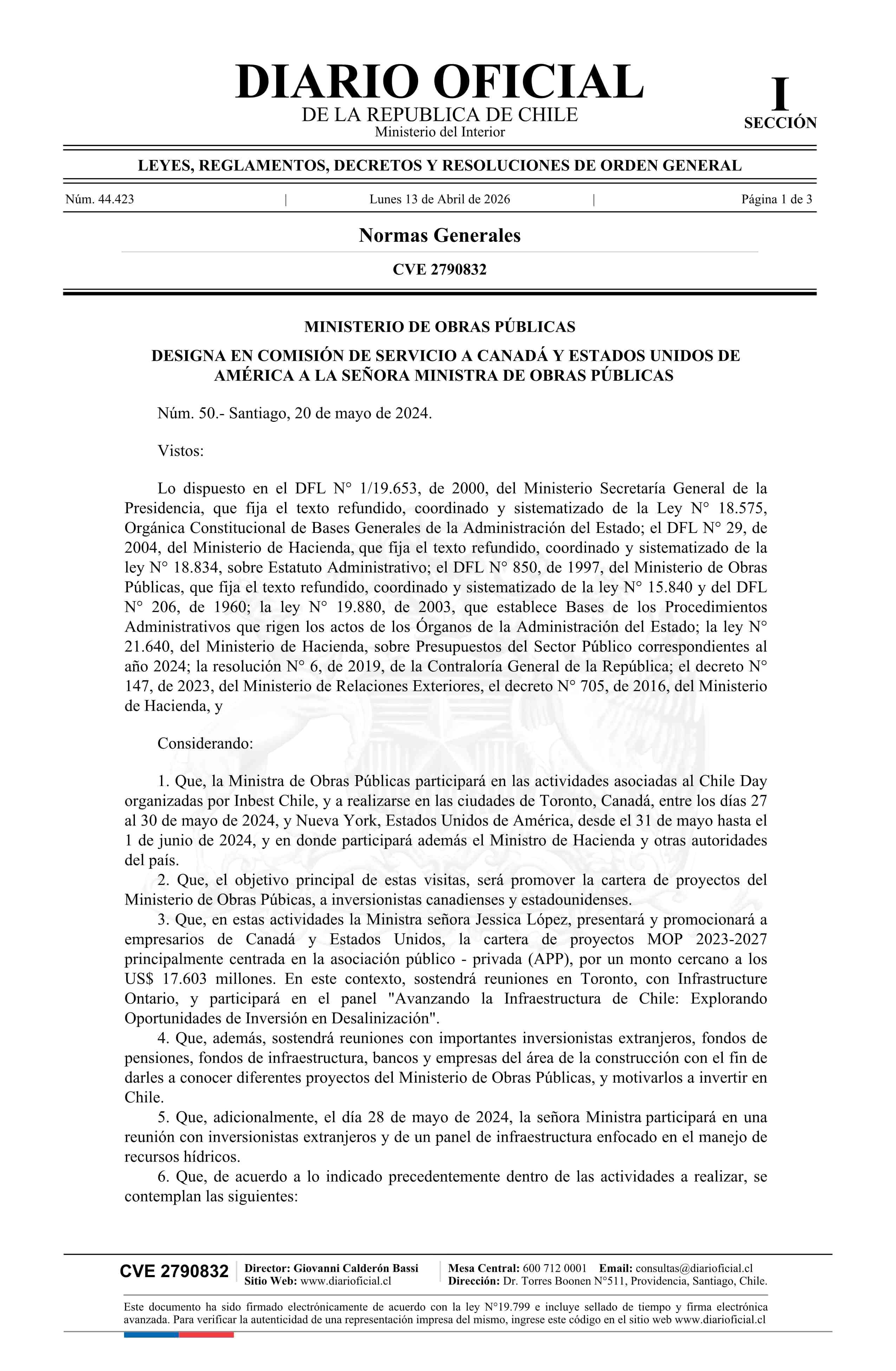 Decreto número 50, de 2024.- Designa en comisión de servicio al extranjero a doña Jessica López Saffie, Ministra de Obras Públicas, a Canadá y Estados Unidos de América 13-04-2026 Diario Oficial Edición Electrónica |