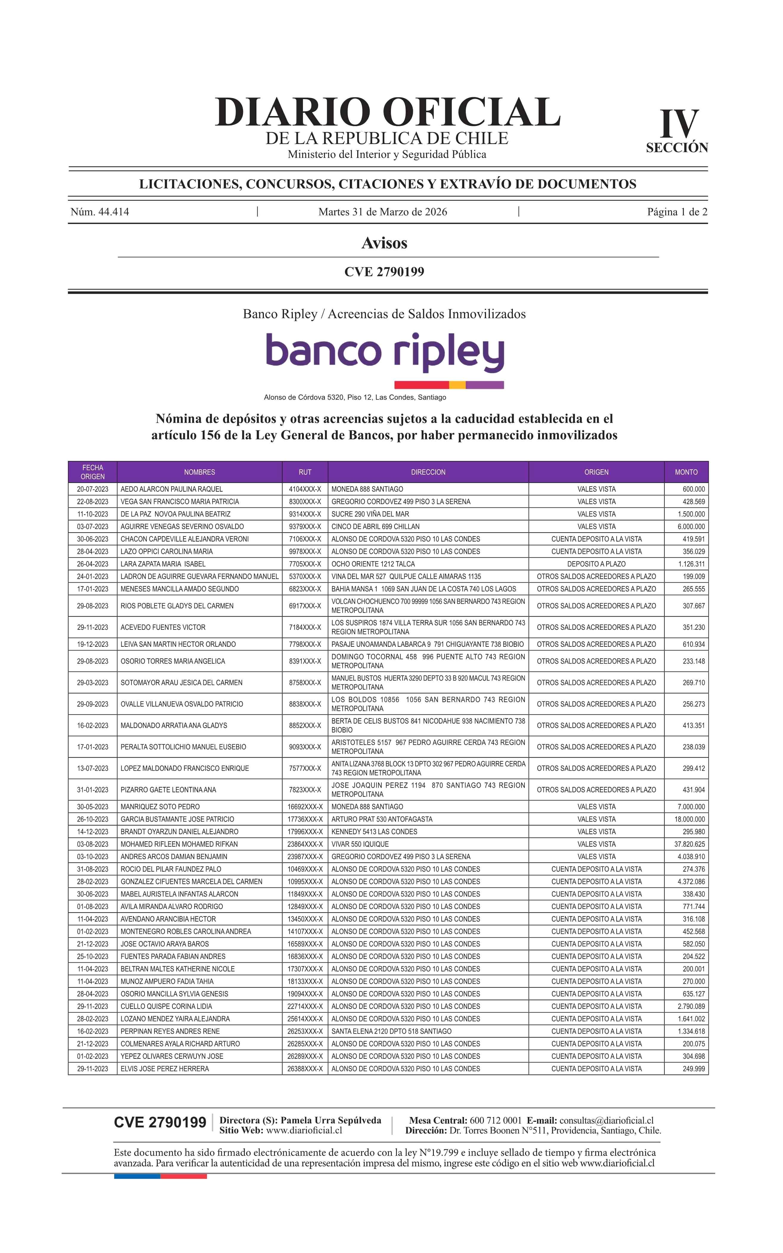 Título: AVISO LICITACIONES: BANCO RIPLEY: Nómina de depósitos y otras acreencias sujetos a la caducidad establecida en el artículo 156 de la Ley General de Bancos, por haber permanecido inmovilizados