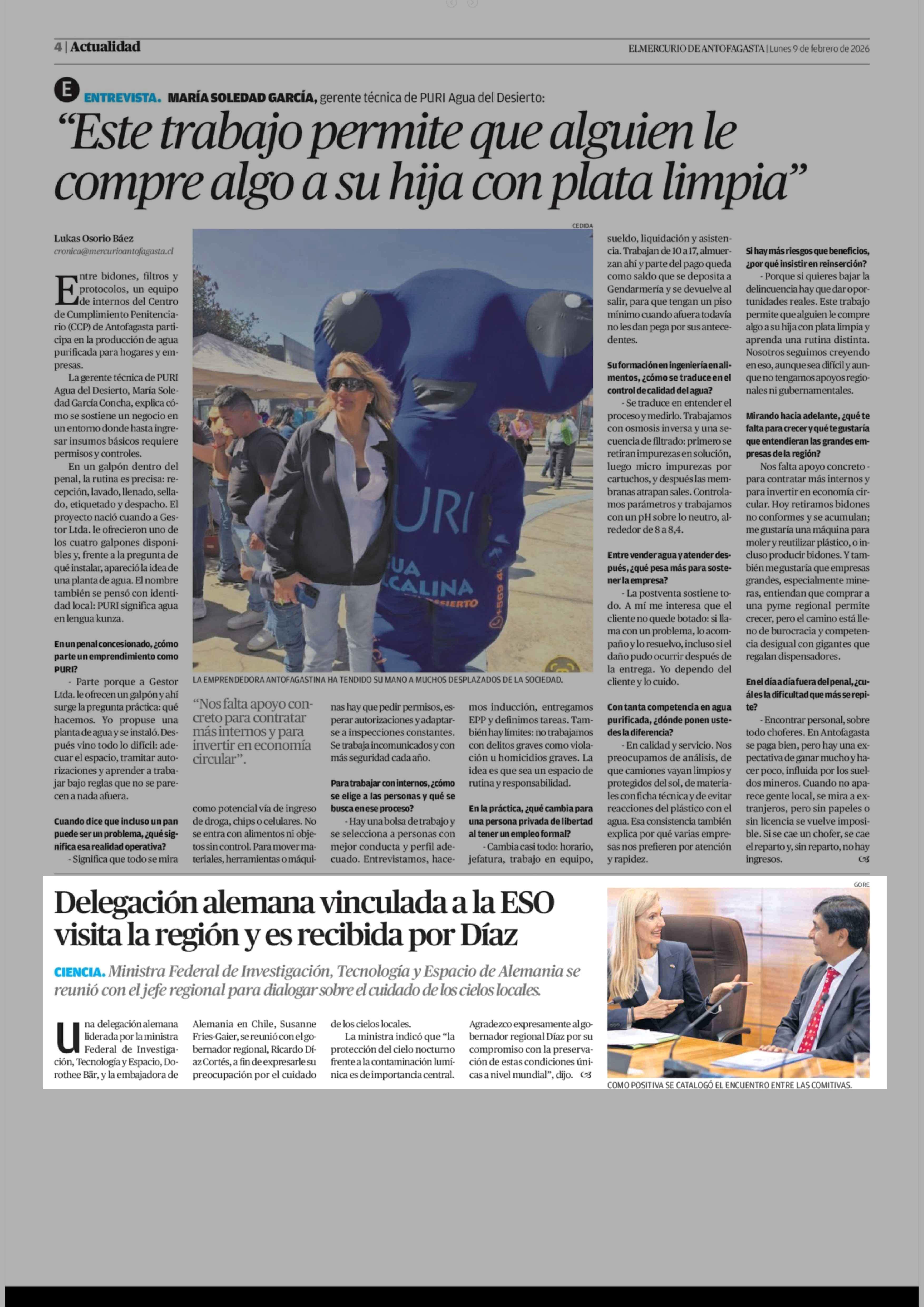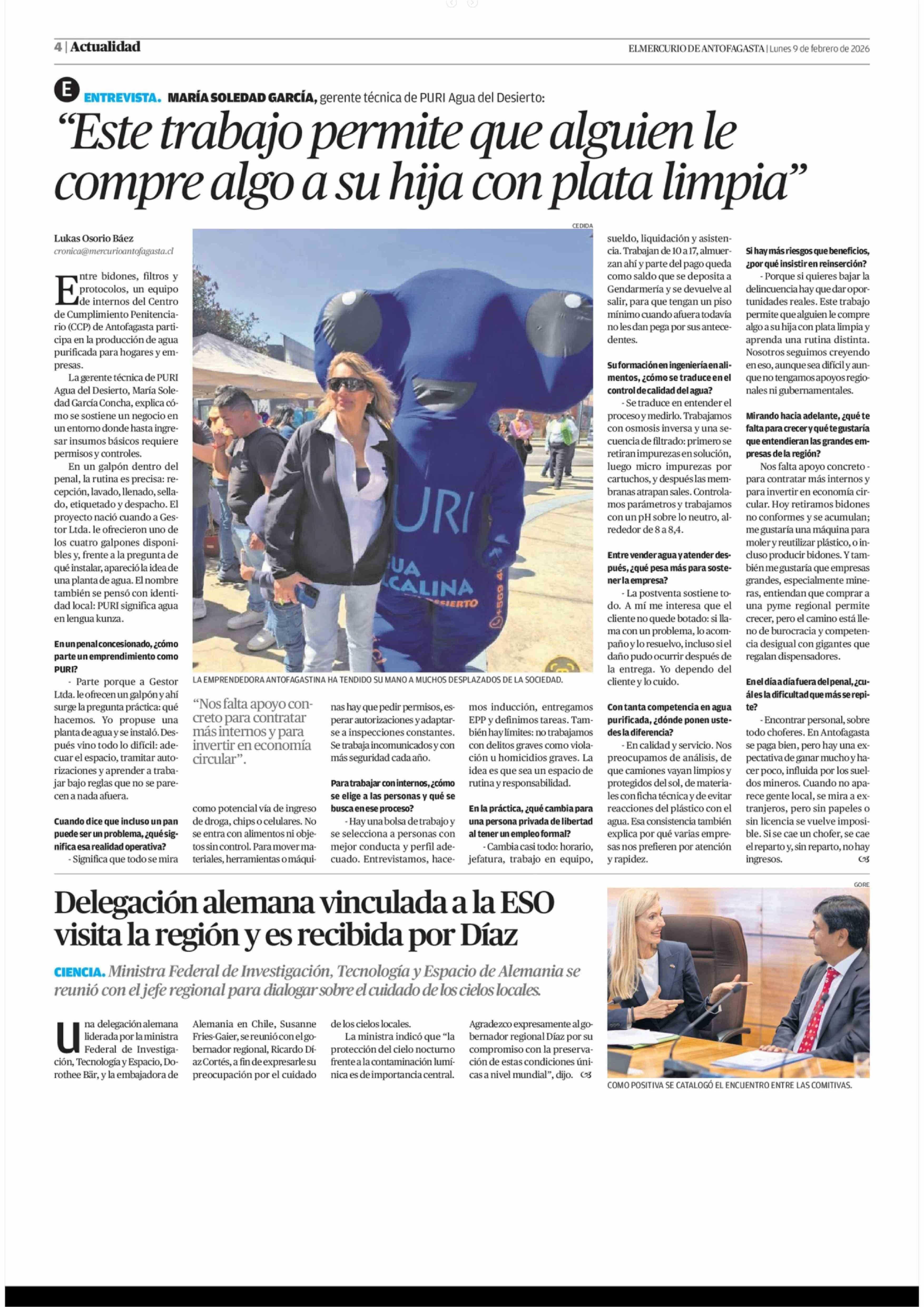 Delegación alemana vinculada a la ESO visita la región y es recibida por Díaz 09-02-2026 El Mercurio de Antofagasta |