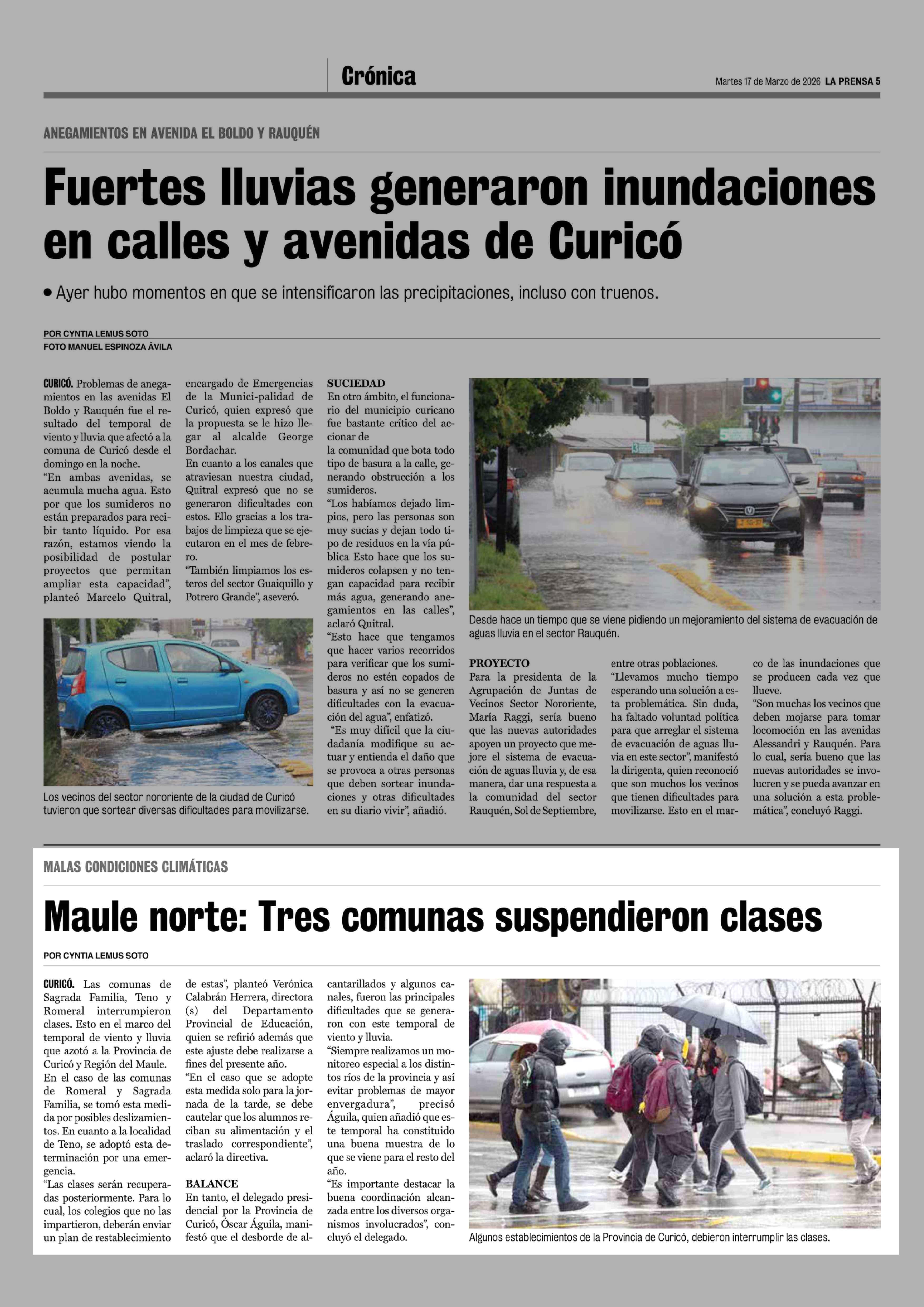Maule norte: Tres comunas suspendieron clases 17-03-2026 La Prensa de Curicó |