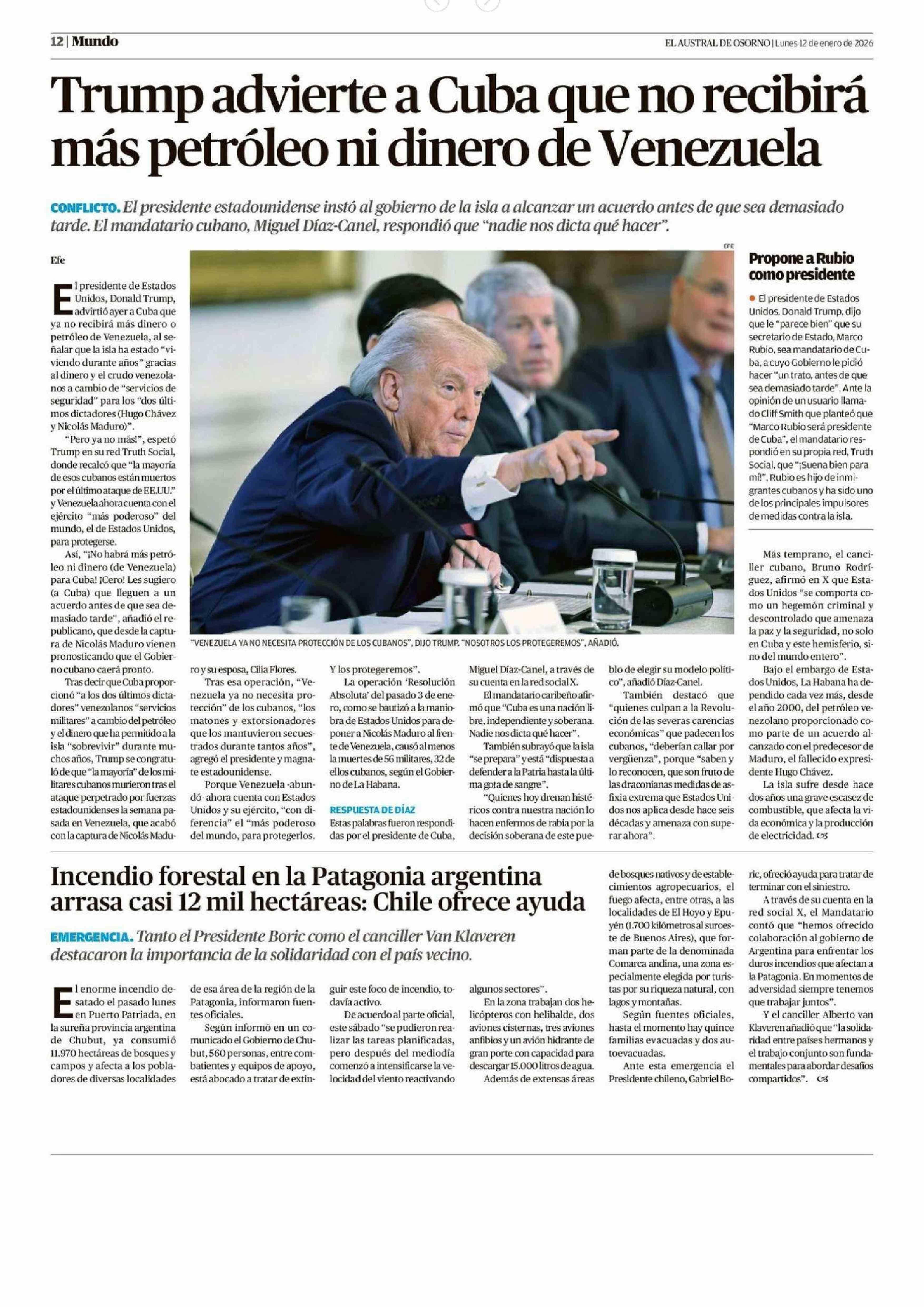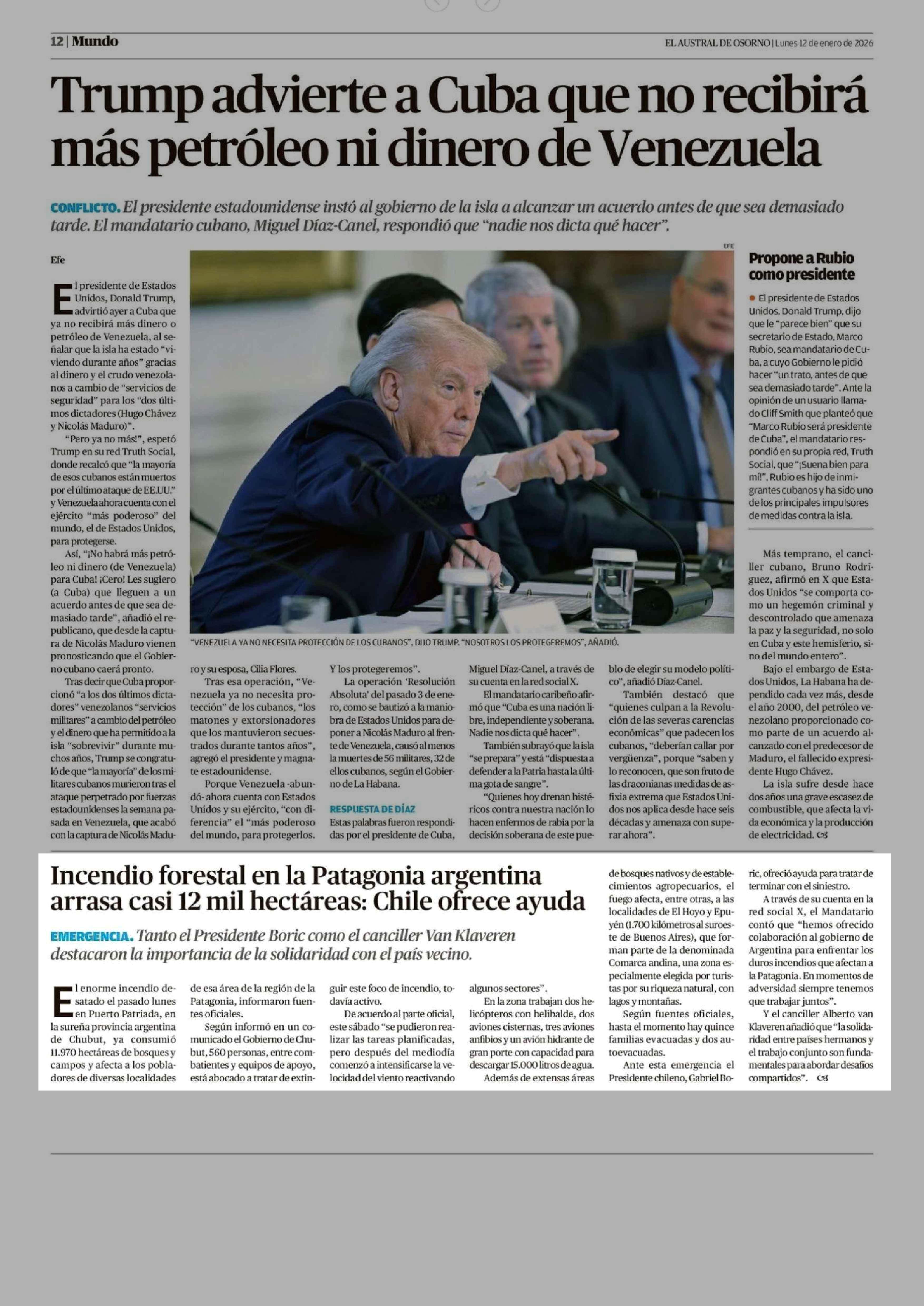 Incendio forestal en la Patagonia argentina arrasa casi 12 mil hectáreas: Chile ofrece ayuda 12-01-2026 El Austral de Osorno |