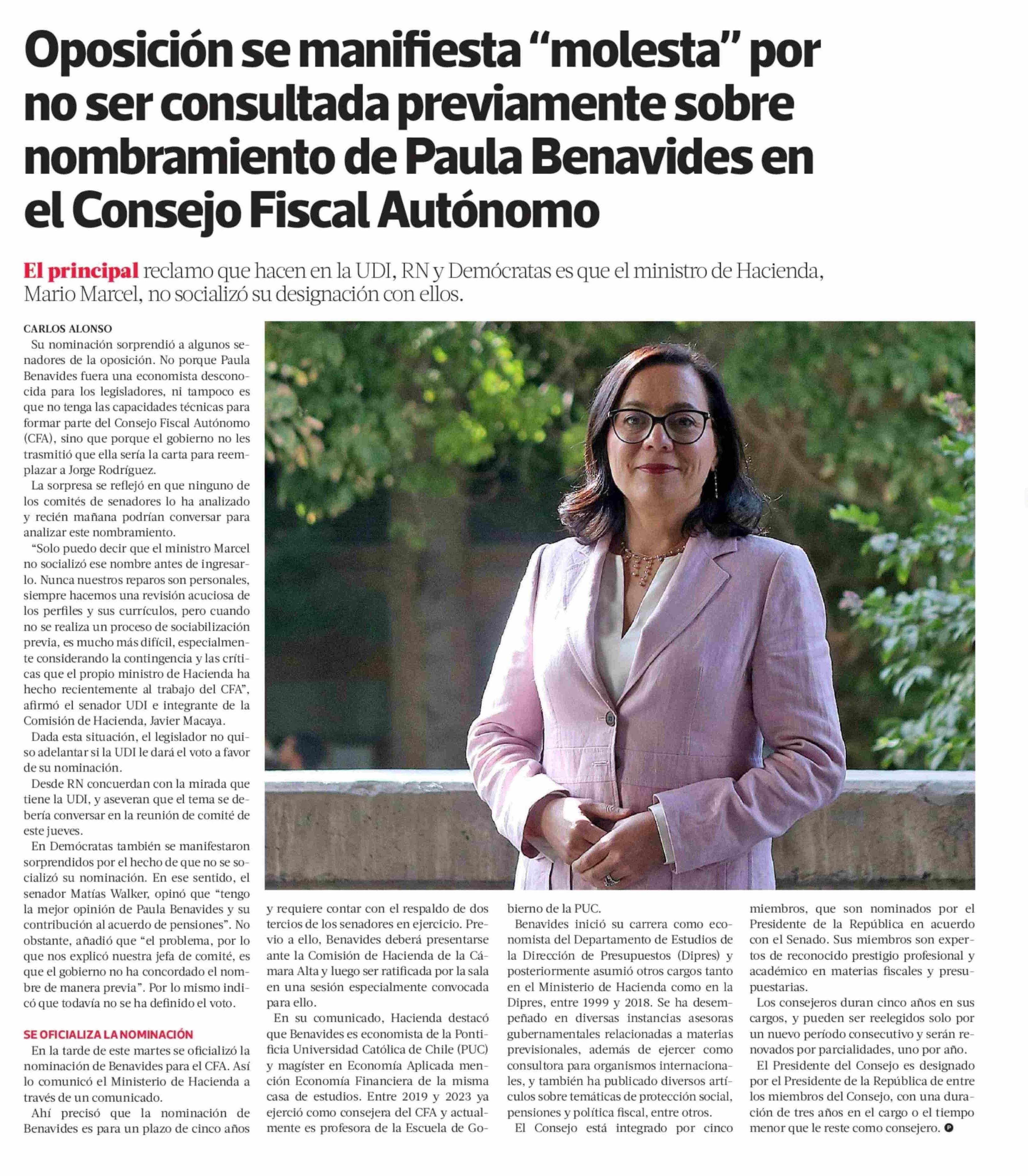 Oposición se manifiesta “molesta” por no ser consultada previamente sobre nombramiento de Paula Benavides en el Consejo Fiscal Autónomo 28-05-2025 La Tercera |